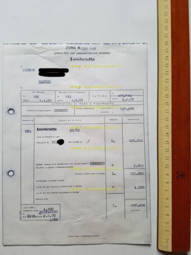 Innocenti Lambretta 50 DL 1970 fattura acquisto originale