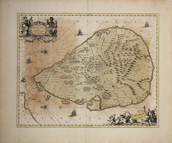 Carta decorativa dello Sri Lanka, pubblicata nelle edizioni successive dell'atlante di Jansson. Questa superba carta di Ceylon è orientata con il nord a sinistra con due rose di bussola e linee lossodromiche. L'isola è ben delineata con montagne, foreste, strade, città, fortezze e templi. È riccamente abbellita da velieri, un mostro marino e due bei cartigli. Il cartiglio del titolo in alto è affiancato dalla rappresentazione allegorica femminile dell'Asia e da un indigeno che tiene in mano un avorio di elefante. Il cartiglio delle miglia, in basso, è circondato da un gruppo di putti. Johannes Janssonius, figlio dell'editore di Arnhem Jan Janssen, sposò Elisabeth Hondius, figlia di Jodocus Hondius, ad Amsterdam nel 1612. Dopo il suo matrimonio, si stabilì in questa città come libraio ed editore di materiale cartografico. Nel 1618 si stabilì ad Amsterdam accanto alla libreria di Willem Jansz. Blaeu, entrando in una seria competizione. Le sue attività non riguardavano solo la pubblicazione di atlanti e libri, ma anche di mappe singole e un vasto commercio di libri con filiali a Francoforte, Danzica, Stoccolma, Copenaghen, Berlino, Koningsbergen, Ginevra e Lione. Nel 1631 iniziò a pubblicare atlanti insieme a Henricus Hondius. Nei primi anni 1640 Henricus Hondius lasciò l'attività di pubblicazione di atlanti completamente a Janssonius. La concorrenza con Joan Blaeu, figlio e successore di Willem, nella produzione di atlanti spinse Janssonius ad ampliare il suo Atlas Novus finalmente in un'opera di sei volumi, in cui furono inseriti un atlante marino e un atlante del Vecchio Mondo. Dopo la morte di Joannes Janssonius, il negozio e la casa editrice furono continuati dagli eredi sotto la direzione di Johannes van Waesbergen (c. 1616-1681), genero di Joannes Janssonius. Le matrici degli atlanti di Janssonius furono in seguito vendute a Schenk e Valck. Incisione in rame coloritura coeva con ritocchi, in ottime condizioni. Rara. Decorative map of Sri Lanka, published in the later editions of Jansson's atlas. This superb map of Ceylon is oriented with north to the left with two compass roses and rhumb lines. The island is well delineated with mountains, forests, roads, cities, forts, and temples. It is richly embellished with sailing ships, a sea monster and two fine cartouches. The title cartouche at top is flanked by the allegorical female representation for Asia and a native holding elephant ivory. The scale of miles cartouche at bottom is surrounded by a group of adorable putti. Johannes Janssonius (Arnhem, 1588-1664), son of the Arnhem publisher Jan Janssen, married Elisabeth Hondius, daughter of Jodocus Hondius, in Amsterdam in 1612. After his marriage, he settled down in this town as a bookseller and publisher of cartographic material. In 1618 he established himself in Amsterdam next door to Blaeu’s book shop. He entered into serious competition with Willem Jansz. Blaeu. His activities not only concerned the publication of atlases and books, but also of single maps and an extensive book trade with branches in Frankfurt, Danzig, Stockholm, Copenhagen, Berlin, Koningsbergen, Geneva, and Lyon. In 1631 he began publishing atlases together with Henricus Hondius. In the early 1640s Henricus Hondius left the atlas publishing business completely to Janssonius. Competition with Joan Blaeu, Willem’s son and successor, in atlas production prompted Janssonius to enlarge his Atlas Novus finally into a work of six volumes, into which a sea atlas and an atlas of the Old World were inserted. After the death of Joannes Janssonius, the shop and publishing firm were continued by the heirs under the direction of Johannes van Waesbergen (c. 1616-1681), son-in-law of Joannes Janssonius. The copperplates from Janssonius’s atlases were afterwards sold to Schenk and Valck. Copperplate, with original colour with retouches, very good condition. Cfr.