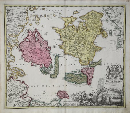 Bella e dettagliata carta geografica delle principali isole e della costa orientale della Danimarca, e parte della Svezia, che comprende la costa svedese con Helsingborg, Landskrona e Malmö, la costa danese con Helsingör e Copenaghen e l'isola di Ween con UranienburgUn elaborato cartiglio, sormontato dallo stemma reale danese, con una grande vignetta con navi che approdano nel porto di Copenaghen, affiancata da diverse sirene. La carta fu realizzata da Homann per il suo Grosser Atlas. Johann Baptist Homann è stato un geografo e cartografo tedesco; nel 1702 fondò la sua casa editrice. Homann acquisì fama come uno dei principali cartografi tedeschi, e nel 1715 fu nominato geografo imperiale dall'imperatore Carlo VI. Nello stesso anno fu anche nominato membro dell'Accademia Prussiana delle Scienze a Berlino. Nel 1716 Homann pubblicò il suo capolavoro Grosser Atlas ueber die ganze Welt. Numerose mappe furono redatte in collaborazione con l'incisore Christoph Weigel. Homann morì a Norimberga nel 1724. Gli successe suo figlio Johann Christoph (1703-1730). L'azienda continuò dopo la sua morte come azienda degli eredi Homann, gestita da Johann Michael Franz e Johann Georg Ebersberger. Dopo successivi cambiamenti nella gestione, l'azienda si sciolse nel 1852. Beautiful and detailed map of the main islands and the eastern coastline of Denmark and a little of Sweden, with the Swedish coast with Helsingborg, Landskrona and Malmö, the Danish coast with Helsingör and Copenhagen and the island of Ween with Uranienburg.An elaborate cartouche, surmounted by the Danish royal coat of arms, with a large vignette of the approach to Copenhagen with ships in the harbor, flanked by numerous mermaids. The map was made by Homann for his Grosser Atlas. Johann Baptist Homann was a German geographer and cartographer; in 1702 he founded his own publishing house. Homann acquired renown as a leading German cartographer, and in 1715 was appointed Imperial Geographer by Emperor Charles VI. In the same year he was also named a member of the Prussian Academy of Sciences in Berlin. In 1716 Homann published his masterpiece Grosser Atlas ueber die ganze Welt; numerous maps were drawn up in cooperation with the engraver Christoph Weigel the Elder. Homann died in Nuremberg in 1724 and was succeeded by his son Johann Christoph (1703-1730). The company carried on upon his death as Homann heirs company, managed by Johann Michael Franz and Johann Georg Ebersberger. After subsequent changes in management the company folded in 1852. Etching with fine original colour, good condition. Cfr.
