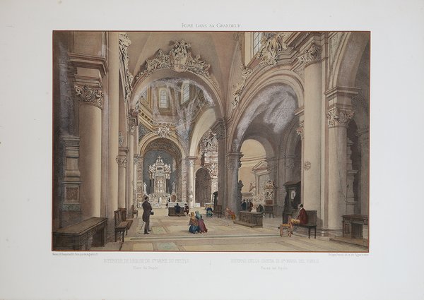 Veduta tratta dalla monumentale opera di Felix Benoist Rome dans sa grandeur. Vues, monument ancient et modernes stampata a Parigi in 3 volumi, da Henri Charpentier, nel 1870. La pubblicazione, illustrata da 100 litografie, fu preceduta da una campagna di disegni preparatori, a far data dal 1864 sino al 1869, eseguita soprattutto da Félix Benoist e in parte da Philippe Benoist. Alla vigilia del Concilio Ecumenico Vaticano I, l’11 agosto 1869, Pio IX decretava la realizzazione di una Esposizione romana delle opere d’ogni arte eseguite per il culto cattolico, che venne inaugurata, il 17 febbraio 1870, nel chiostro della Certosa di Santa Maria degli Angeli. In quell’occasione, vennero presentati i tre volumi in folio Rome dans sa grandeur. I volumi, rilegati in modo sfarzoso, con impresso al centro in oro, lo stemma di Pio IX, sono suddivisi in tre sezioni. Il primo volume tratta di Roma antica, il secondo, di Roma cristiana, ed il terzo, dei monumenti e le realizzazioni della Roma moderna. Una visione preziosa della Roma papale alla vigilia della profonda trasformazione di Roma in capitale dell’Italia unita. Un documento che evidenzia la notevole impronta lasciata da Pio IX nella Città Eterna. L’opera rappresenta il capolavoro dell’artista francese, dove ogni veduta è realizzata in litografia tinta, processo ottenuto usando un diverso numero di pietre. Il risultato è un’opera di grande effetto, tanto da porre il Benoist tra la schiera dei più grandi artisti di interni e vedute del suo tempo. Litografia tinta, finemente colorata a mano, in ottimo stato di conservazione. View taken from the monumental work of Felix Benoist Rome dans sa grandeur. Vues, monument ancient et modernes printed in Paris in 3 volumes, by Henri Charpentier, in 1870. The publication, illustrated by 100 lithographs, was preceded by a campaign of preparatory drawings, from 1864 to 1869, executed mainly by Felix Benoist and partly by Philippe Benoist. On the eve of the First Vatican Ecumenical Council, August 11, 1869, Pius IX decreed the creation of the Esposizione romana delle opere d’ogni arte eseguite per il culto cattolico (a Roman Exhibition of the works of art created for Catholic worship), which was inaugurated on February 17, 1870, in the cloister of the Charterhouse of Santa Maria degli Angeli. On that occasion, the three volumes in folio Rome dans sa grandeur were presented. The volumes, magnificently bound, with the coat of arms of Pius IX stamped in gold in the center, are divided into three sections. The first volume deals with ancient Rome, the second with “Christian” Rome, and the third with the monuments and achievements of modern Rome. A precious vision of papal Rome on the eve of the profound transformation of Rome into the capital of united Italy. A document that highlights the remarkable imprint left by Pius IX in the Eternal City. The work represents the masterpiece of the French artist, where each view is made in tinted lithography, a process achieved by using a different number of stones. The result is a work of great effect, so much so as to place Benoist among the ranks of the greatest artists of interiors and views of his time. Tinted lithograph, finely hand-colored, in excellent condition. Cfr.