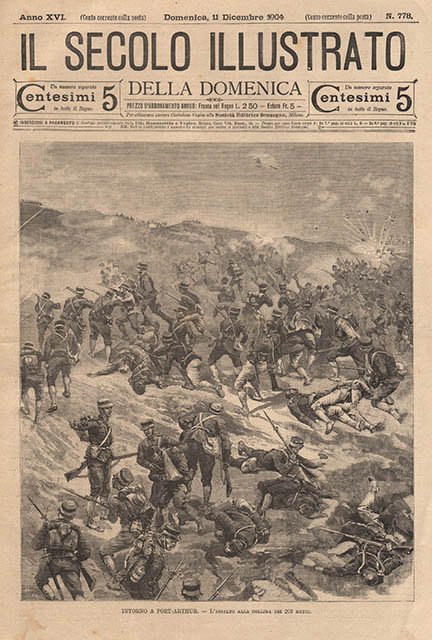 Veduta dell’assalto al colle Quota 203, conquistato dai giapponesi il 5 dicembre 1904. Testo al retro