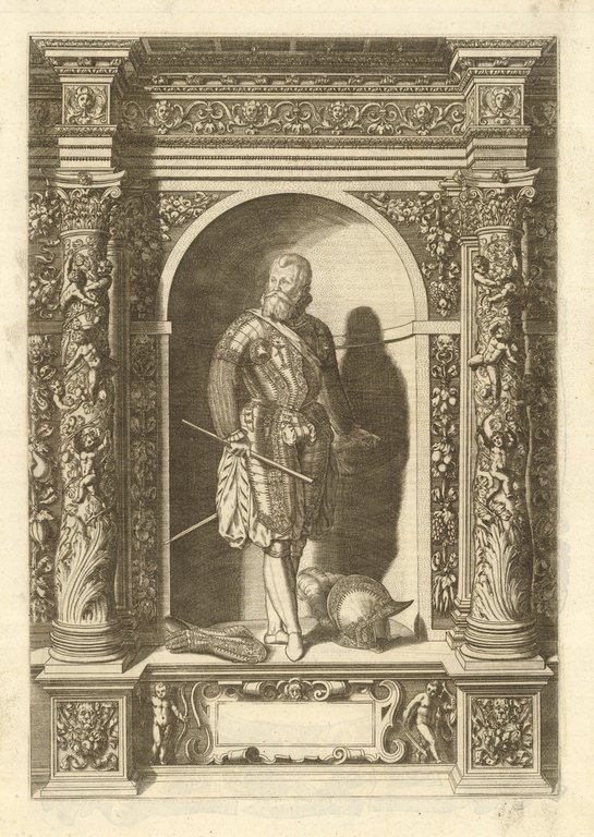 Ritratto di Johann Fernberger von Aur (1511-1584) importante ufficiale militare austriaco. L'incisione, al verso, è accompagnata da un testo biografico composto da Jacob Schrenk von Notzing racchiuso da un'elegante cornice silografica a volute ed elementi militari.