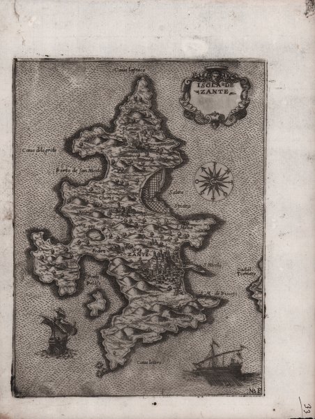In basso a sinistra in una targa ZANTE insula posta nel mare Mediteraneo longi dalla Morea mil. 25. locho delli Ill.mi Venetiani abondante di bonissimi vini, pece, vene di metalli ma sottoposta a teremotti, et tiene di circuito da mill. 60 con bonissimo aere. In alto rosa dei venti con il nord in alto. Nell’angolo in basso a destra il numero 42. Carta priva di scala grafica e graduazione ai margini. Acquaforte e bulino, mm 172x206.Notizie storico critiche: Carta anonima, priva di data ed indicazioni editoriali, edita da Camocio. La mappa circolava come carta sciolta prima di essere inserita nella raccolta Isole famose, porti, fortezze e terre marittime sottoposte alla Serenissima Signoria di Venetia, ed altri Principi Christiani, et al Signor Turco, nouamente poste in luce. In Venetia alla libreria del segno di San Marco. Esistono pertanto delle prove prive di numerazione, che si trovano in alcune raccolte cinquecentesche; esistono altresì delle prove avanti il numero che si trovano negli isolari camociani. Alla morte dell’editore (1575) le lastre furono acquisite da Donato Bertelli, che le ristampò aggiungendo una numerazione sequenziale. The probably best known cartographic works of the engraver Natale Bonifacio is a serie of maps showing Greek Islands in the Ionian en Aegean Seas. They are all undated and their chronological sequence is difficult to ascertain. Like the larger maps of The IATO these smaller ones were first issued for a loose sheet circulation, and then assembled in booklet form for interested customer. Some of the maps, separately issued, appear in copies of the first edition of Ferrando Bertelli’s “Civitatum aliquot insignorum et locorum magis monitorum exacta delineation cum additione aliquot Insularum principalium. Disegni di alcune più illustri città et fortezze del mondo con aggionta di alcune Isole principali”, of 1568. Others are known only from the second edition of the Bertelli book, published by Donato in 1574 and from the undated “Isole Famose…” by Giovanni Francesco Camocio. As noted by Meurer, due of they small format, they were infrequently added to composite atlases. The present map of Zakynthos seems to be based on an original drawing. The depiction of the essential elements is fairly correct, although the bays appear overestimated in size. Fantastic early impression. Cfr. Gallo (1950): p. 97, n. 42 e p. 99, n. 26; Tolias (2011): n. 0390; Zacharakis (1992): n. 508; Zacharakis (2009): n. 782.