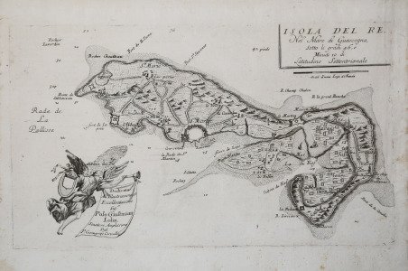 Ile de Ré in Bretagna, situata nel Golfo di Biscaglia, al largo della costa francese. Opera tratta dal ' Corso geografico universale, o sia la terra divisa nelle sue parti e subdistinta ne' suoi gran regni. Esposta in tavole geografiche ricorrette et accresciute di tutte le nuove scoperte, ad uso dell'Accademia Cosmografica degli Argonauti dal Padre Maestro Vincenzo Coronelli M. C. Cosmografo della Serenissima Republica di Venetia. Dedicata alla Santità di Nostro Signore Innocenzo XII. P. I. In Venetia, a spese dell'autore. MDCXCII. Coronelli visse un periodo di straordinaria fecondità editoriale a partire dal 1689, quando ebbe la cattedra di geografia presso l'Università alle Procuratie, con la pubblicazione, nel 1690, del primo volume dell'Atlante Veneto. In effetti sotto il nome di ' Atlante Veneto ' va tutta la raccolta di tredici opere composte nell'arco del decennio successivo, dall'Isolario ' allo ' Specchio del mare. In realtà solo alcune di tali opere possono definirsi atlante, e sono di valore molto disuguale, dato che si passa da opere originali e fondamentali come quelle citate o il ' Corso Geografico ' ad opere di compilazione o semplici raccolte di vedute. Il ' Corso Geografico ' uscì in diverse edizioni con numeri diversi di carte - sessantotto tavole nel 1689-92; di centosettantatré tavole nel 1692; duecentosessanta tavole, nel 1694-97 - che venivano vendute anche separatamente, al ritmo di sei carte al mese per due anni. Le carte furono incise tra il 1688 e il 1692 nell'attrezzatissima officina cartografica del convento dei Frari, dove lavoravano anche incisori stranieri. ' Incisione in rame, in ottimo stato di conservazione. Ile de Ré in Bretagne, located in the Bay of Biscay off the coast of France. The map is taken from ' Corso geografico universale, o sia la terra divisa nelle sue parti e subdistinta ne' suoi gran regni. Esposta in tavole geografiche ricorrette et accresciute di tutte le nuove scoperte, ad uso dell'Accademia Cosmografica degli Argonauti dal Padre Maestro Vincenzo Coronelli M. C. Cosmografo della Serenissima Republica di Venetia. Dedicata alla Santità di Nostro Signore Innocenzo XII. P. I. In Venetia, a spese dell'autore. MDCXCII. Coronelli lived a period of extraordinary editorial fecundity starting from 1689, when he had the chair of geography at the University at the Procuratie, with the publication, in 1690, of the first volume of the ' Atlante Veneto. Under the name of ' Atlante Veneto ' goes the entire collection of thirteen works composed over the next decade, from the ' Isolario ' to the ' Specchio del mare. ' In reality, only some of these works can be defined as atlas, and are of very unequal value, since we go from original and fundamental works such as those mentioned or the ' Corso Geografico ' to works of compilation or simple collections of views. The ' Corso Geografico ' came out in several editions with different numbers of maps - sixty-eight maps in 1689-92; one hundred and seventy-three maps in 1692; two hundred and sixty maps in 1694-97 - which were also sold separately, at the rate of six a month for two years. The maps were alle engraved between 1688 and 1692 in the well-equipped cartographic workshop of the Frari convent, where foreign engravers also worked. ' Cfr.
