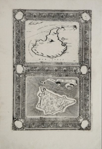 Carta geografica di Zante di Vincenzo Coronelli, arricchita dai bordi "farnesiani" stampati separatamente e commissionati appositamente dal patrono di Coronelli, Ranuccio II Farnese, duca di Parma. Si tratta di una sorta di edizione di lusso che Coronelli dedica a Ranuccio II, una selezione delle opere prodotte ornata da una elegante cornice ornamentale. Le tavole farnesiane si possono occasionalmente trovare anche in altre pubblicazioni del Coronelli, a partire dall’Isolario del 1696. Coronelli visse un periodo di straordinaria fecondità editoriale a partire dal 1689, quando ebbe la cattedra di geografia presso l'Università alle Procuratie, con la pubblicazione, nel 1690, del primo volume dell'Atlante Veneto. In effetti sotto il nome di Atlante Veneto va tutta la raccolta di tredici opere composte nell'arco del decennio successivo, dall'Isolario allo Specchio del mare. L'opera era intesa come un'estensione dell'Atlas Maior di Blaeu. Non è una semplice raccolta di mappe, ma piuttosto "un compendio di informazioni geografiche, cosmografiche e scientifiche. sulla scienza e la geografia italiana contemporanea" (Scammell). Incisione in rame, magnifica prova, con pieni margini, in perfetto stato di conservazione. Bibliografia Ermanno Armao, Vincenzo Coronelli (Firenze, 1944), nn.59-60, p.237. Map of Zakynthos by Vincenzo Coronelli, enriched by the "Farnese" borders printed separately and specially commissioned by Coronelli's patron, Ranuccio II Farnese, Duke of Parma. This is a sort of luxury edition that Coronelli dedicated to Ranuccio II, a selection of the works produced adorned with an elegant ornamental frame. The Farnese plates can occasionally be found in other publications of Coronelli, starting with the Isolario of 1696. Coronelli lived a period of extraordinary editorial fecundity starting from 1689, when he had the chair of geography at the University at the Procuratie, with the publication, in 1690, of the first volume of the Atlante Veneto. Under the name of Atlante Veneto goes the entire collection of thirteen works composed over the next decade, from the Isolario to the Specchio del mare. The work was intended as an extension of Blaeu’s Atlas Maior. It is no mere collection of maps, but rather “a compendium of geographical, cosmographical, and scientific information. on contemporary Italian science and geography” (Scammell). Copperplate, with full margins, very good condition. Very rare. Literature Ermanno Armao, Vincenzo Coronelli (Florence, 1944), no.59, no.60 and p.237. Cfr.