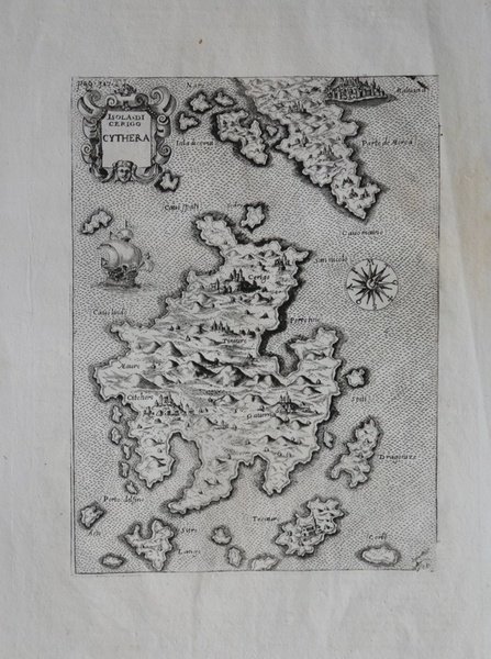 La mappa di Citéra è abbastanza fedele alla realtà. Come giustamente fa notare il Meurer il lavoro cartografico più noto del Bonifacio fu la serie delle mappe raffiguranti le isole dell’arcipelago greco, sia del Mar Jonio che dell’Egeo. Esse non sono datate e quindi è difficile assegnare una sequenza cronologica alla serie, databile al periodo 1567/68. Come tutte le carte della cosiddetta scuola lafreriana venivano stampate a se e quindi assemblate in atlanti compositi. Questo esemplare è tratto dall'opera ' Universus terrarum orbis scriptorum calamo delineatus . qui de Europae, Asiae, Africae, & Americae regnis, provinciis, populis, civitatibus. pubblicata a Padova nel 1713, presso Matteo Cadorin, da Raffaello Savonarola, sotto lo pseudonimo di Lasor a Varea (o Varela). L'opera era una sorta di enciclopedia che conteneva notizie sulle varie località del mondo disposte in ordine alfabetico, arricchita da mappe e vedute di tutto il mondo che appartengono a celebri raccolte cartografiche del passato – Bertelli, Valegio, Camocio, Bonifacio, Nelli, Magini e altri – del quale probabilmente l’editore Cadorin era in possesso delle matrici originali. Incisione su rame, ampi margini, in ottimo stato di conservazione. The probably best known cartographic works of the engraver Natale Bonifacio is a serie of maps showing Greek Islands in the Ionian en Aegean Seas. They are all undated and their chronological sequence is difficult to ascertain. Like the larger maps of The IATO these smaller ones were first issued for a loose sheet circulation, and then assembled in booklet form for interested customer. This example is taken from the work ' Universus terrarum orbis scriptorum calamo delineatus . qui de Europae, Asiae, Africae, & Americae regnis, provinciis, populis, civitatibus. ' published in Padua in 1713, at Matteo Cadorin, by Raffaello Savonarola, under the pseudonym of Lasor a Varea (or Varela). The work was a kind of encyclopedia containing news about the various localities of the world arranged in alphabetical order, enriched with maps and views of the whole world belonging to famous cartographic collections of the past-Bertelli, Valegio, Camocio, Bonifacio, Nelli, Magini, and others-of which the publisher Cadorin probably possessed the original plates. Copper engraving, in excellent condition. Cfr. Zacharakis, A catalogue of printed maps of Greece, 206.