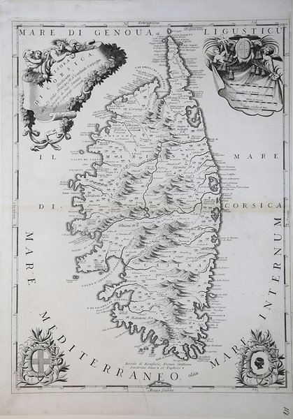 Decorativa e ricercata carta della Corsica tratta dal ' Corso geografico universale, o sia la terra divisa nelle sue parti e subdistinta ne' suoi gran regni. Esposta in tavole geografiche ricorrette et accresciute di tutte le nuove scoperte, ad uso dell'Accademia Cosmografica degli Argonauti dal Padre Maestro Vincenzo Coronelli M. C. Cosmografo della Serenissima Republica di Venetia. Dedicata alla Santità di Nostro Signore Innocenzo XII. P. I. In Venetia, a spese dell'autore. MDCXCII. Coronelli visse un periodo di straordinaria fecondità editoriale a partire dal 1689, quando ebbe la cattedra di geografia presso l'Università alle Procuratie, con la pubblicazione, nel 1690, del primo volume dell'Atlante Veneto. In effetti sotto il nome di ' Atlante Veneto ' va tutta la raccolta di tredici opere composte nell'arco del decennio successivo, dall'Isolario ' allo ' Specchio del mare. In realtà solo alcune di tali opere possono definirsi atlante, e sono di valore molto disuguale, dato che si passa da opere originali e fondamentali come quelle citate o il ' Corso Geografico ' ad opere di compilazione o semplici raccolte di vedute. Il ' Corso Geografico ' uscì in diverse edizioni con numeri diversi di carte - sessantotto tavole nel 1689-92; di centosettantatré tavole nel 1692; duecentosessanta tavole, nel 1694-97 - che venivano vendute anche separatamente, al ritmo di sei carte al mese per due anni. Le carte furono incise tra il 1688 e il 1692 nell'attrezzatissima officina cartografica del convento dei Frari, dove lavoravano anche incisori stranieri. ' La carta è priva di testo descrittivo al verso, che invece è presente negli esemplari inseriti nell'Isolario del 1696. Incisione in rame, in ottimo stato di conservazione. Decorative and highly detailed map of Corsica, with 4 gorgeous cartouches, including coats of arms and other embellishments. Remarkable treatment of the island, including mountains, rivers, towns, villags, ports, gulfs, bays, smaller islands, etc. The map is taken from ' Corso geografico universale, o sia la terra divisa nelle sue parti e subdistinta ne' suoi gran regni. Esposta in tavole geografiche ricorrette et accresciute di tutte le nuove scoperte, ad uso dell'Accademia Cosmografica degli Argonauti dal Padre Maestro Vincenzo Coronelli M. C. Cosmografo della Serenissima Republica di Venetia. Dedicata alla Santità di Nostro Signore Innocenzo XII. P. I. In Venetia, a spese dell'autore. MDCXCII. Coronelli lived a period of extraordinary editorial fecundity starting from 1689, when he had the chair of geography at the University at the Procuratie, with the publication, in 1690, of the first volume of the ' Atlante Veneto. Under the name of ' Atlante Veneto ' goes the entire collection of thirteen works composed over the next decade, from the ' Isolario ' to the ' Specchio del mare. ' In reality, only some of these works can be defined as atlas, and are of very unequal value, since we go from original and fundamental works such as those mentioned or the ' Corso Geografico ' to works of compilation or simple collections of views. The ' Corso Geografico ' came out in several editions with different numbers of maps - sixty-eight maps in 1689-92; one hundred and seventy-three maps in 1692; two hundred and sixty maps in 1694-97 - which were also sold separately, at the rate of six a month for two years. The maps were alle engraved between 1688 and 1692 in the well-equipped cartographic workshop of the Frari convent, where foreign engravers also worked. ' Cfr. F. Cervoni, "Image de la Corse", 42.2.