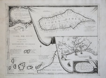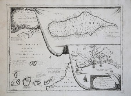 Bella mappa delle Isole Canarie. La mappa è piena di linee lossodromiche, rose dei venti a giglio e molte annotazioni e include una parte della costa africana. Con due grandi cartigli che riempiono la metà destra e che poggiano su uno sfondo a panneggio. Il riquadro superiore è una carta dettagliata dell'isola di Madeira, un arcipelago vulcanico nell'Atlantico settentrionale a nord delle Isole Canarie. La città di Madera (Fanchal) è mostrata in basso in una vista a volo d'uccello che include diverse navi nel porto. La mappa è molto decorativa e splendidamente incisa nello stile caratteristico di Coronelli. Dedicata ad Alvise da Mosto, "Procr di S. M. Sauio Grande". Opera tratta dal ' Corso geografico universale, o sia la terra divisa nelle sue parti e subdistinta ne' suoi gran regni. Esposta in tavole geografiche ricorrette et accresciute di tutte le nuove scoperte, ad uso dell'Accademia Cosmografica degli Argonauti dal Padre Maestro Vincenzo Coronelli M. C. Cosmografo della Serenissima Republica di Venetia. Dedicata alla Santità di Nostro Signore Innocenzo XII. P. I. In Venetia, a spese dell'autore. MDCXCII. Coronelli visse un periodo di straordinaria fecondità editoriale a partire dal 1689, quando ebbe la cattedra di geografia presso l'Università alle Procuratie, con la pubblicazione, nel 1690, del primo volume dell'Atlante Veneto. In effetti sotto il nome di ' Atlante Veneto ' va tutta la raccolta di tredici opere composte nell'arco del decennio successivo, dall'Isolario ' allo ' Specchio del mare. In realtà solo alcune di tali opere possono definirsi atlante, e sono di valore molto disuguale, dato che si passa da opere originali e fondamentali come quelle citate o il ' Corso Geografico ' ad opere di compilazione o semplici raccolte di vedute. Il ' Corso Geografico ' uscì in diverse edizioni con numeri diversi di carte - sessantotto tavole nel 1689-92; di centosettantatré tavole nel 1692; duecentosessanta tavole, nel 1694-97 - che venivano vendute anche separatamente, al ritmo di sei carte al mese per due anni. Le carte furono incise tra il 1688 e il 1692 nell'attrezzatissima officina cartografica del convento dei Frari, dove lavoravano anche incisori stranieri. ' Acquaforte, impressa su carta vergata coeva, consueta traccia di piega centrale, per il resto in ottimo stato di conservazione. Beautiful map of the Canary Islands. The map is filled with rhumblines, fleur-de-lis and many notations and includes a portion of the African coastline. With two large inset charts filling the right half resting on a tasseled drapery background. The upper inset is a detailed chart of the island of Madeira, a volcanic archipelago in the North Atlantic north of the Canary Islands. The town of Madera (Fanchal) is shown below in a birds eye view that includes several ships in the harbor with the fortified town at the shore. The map is very decorative and beautifully engraved in Coronelli's characteristic style. ' Dedicated to Alvise da Mosto, "Procr di S. M. Sauio Grande". Map is taken from ' Corso geografico universale, o sia la terra divisa nelle sue parti e subdistinta ne' suoi gran regni. Esposta in tavole geografiche ricorrette et accresciute di tutte le nuove scoperte, ad uso dell'Accademia Cosmografica degli Argonauti dal Padre Maestro Vincenzo Coronelli M. C. Cosmografo della Serenissima Republica di Venetia. Dedicata alla Santità di Nostro Signore Innocenzo XII. P. I. In Venetia, a spese dell'autore. MDCXCII. Coronelli lived a period of extraordinary editorial fecundity starting from 1689, when he had the chair of geography at the University at the Procuratie, with the publication, in 1690, of the first volume of the ' Atlante Veneto. Under the name of ' Atlante Veneto ' goes the entire collection of thirteen works composed over the next decade, from the ' Isolario ' to the ' Specchio del mare. ' In reality, only some of these works can be defined as atlas, and are of very unequal value, since we go from original and fundamental works such as those mentioned or the ' Corso Geografico ' to works of compilation or simple collections of views. The ' Corso Geografico ' came out in several editions with different numbers of maps - sixty-eight maps in 1689-92; one hundred and seventy-three maps in 1692; two hundred and sixty maps in 1694-97 - which were also sold separately, at the rate of six a month for two years. The maps were alle engraved between 1688 and 1692 in the well-equipped cartographic workshop of the Frari convent, where foreign engravers also worked. ' Copper engraving, printed on contemporary laid paper, central vertical fold, in good condition. Cfr.