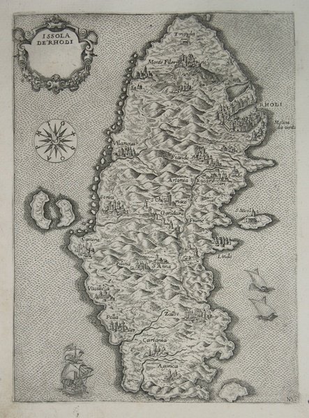 La carta di Rodi sembra una riduzione dell’opera a lui stesso attribuita, datata al 1570, ma forse anteriore. La carta appartiene ad un corpus di mappe raffiguranti le isole dell’arcipelago greco, sia del Mar Jonio che dell’Egeo. Meurer afferma che le mappe costituiscano il lavoro cartografico più noto del Bonifacio; non datate, è quindi difficile assegnare una sequenza cronologica alla serie, vengono fatte risalire al periodo 1567-70. Le carte si trovano occasionalmente nelle raccolte cinquecentesche, spesso in gruppo numeroso. Alcune Vengono incluse anche nella raccolta di carte di piccolo formato della famiglia Bertelli, il Civitatum aliquot insignorum et locorum magis monitorum exacta delineation cum additione aliquot Insularum principalium. Disegni di alcune più illustri città et fortezze del mondo con aggionta di alcune Isole principali edito da Ferrando Bertelli nel 1568. Altre compaiono solo nella successiva ristampa curata da Donato Bertelli nel 1574, quindi si presume siano state realizzate dopo la prima edizione del Civitatum. Le carte vengono spesso erroneamente attribuite dalla letteratura proprio a Donato Bertelli, che ne curò solamente la stampa. La lastra conosce una successiva ristampa nel 1713; è infatti inserita nell’opera Universus terrarum orbis scriptorum calamo delineatus di Alphonsus Lasor a Varea (prseudonimo di Raffaello Savonarola), edito a Padova. The probably best known cartographic works of the engraver Natale Bonifacio is a serie of maps showing Greek Islands in the Ionian en Aegean Seas. They are all undated and their chronological sequence is difficult to ascertain. Like the larger maps of The IATO these smaller ones were first issued for a loose sheet circulation, and then assembled in booklet form for interested customer. Some of the maps, separately issued, appear in copies of the first edition of Ferrando Bertelli’s “Civitatum aliquot insignorum et locorum magis monitorum exacta delineation cum additione aliquot Insularum principalium. Disegni di alcune più illustri città et fortezze del mondo con aggionta di alcune Isole principali”, of 1568. Others are known only from the second edition of the Bertelli book, published by Donato in 1574 and from the undated “Isole Famose…” by Giovanni Francesco Camocio. As noted by Meurer, due of they small format, they were infrequently added to composite atlases. Cfr. Meurer (2002): n. 173; Gallo (1950): p. 99, n. 46; Tolias (2011): n. 0086; Zacharakis (1992): nn. 218, 1231; Zacharakis (2009): nn. 349, 1858.