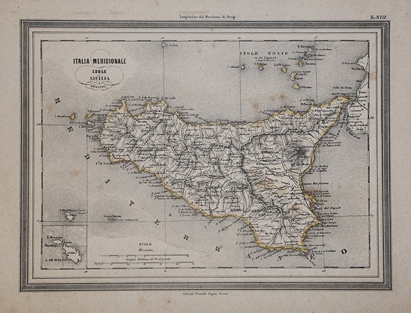 Decorativa carta della Sicilia, pubblicata ' nell'Atlante di geografia universale preceduto da un vocabolario de' nomi tecnici della geografia, corredato di specchi statistici delle divisioni politiche della terra, ed arricchito d'illustrazioni e di una bilancia politica del globo per servire al corso di geografia universale, di Marmocchi. Pubblicato a partire dal 1838, venne nel corso degli anni notevolmente integrato e ampliato. Il Marmocchi (Poggibonsi, 1805 - Ginevra, 1858) fu noto geografo e cartografo. In rapporti con Mazzini, fu coinvolto nei moti politici del 1831 e subì dure persecuzioni che si spinsero sino alla prigionia da parte del governo granducale. Eletto nel 1848 deputato al Parlamento toscano, fu nominato con decreto granducale Segretario del Ministero dell'Interno allora retto dal Guerrazzi. Emigrato poi a Roma, e ancora dopo in Corsica, che perlustrò a lungo con il Gregorovius, si fissò successivamente a Torino e, infine, a Genova, dove rimase per il resto della vita attendendo soprattutto a compilazioni geografiche. Litografia stampata dalla tipografia Doyen, colorata a mano in epoca, in buono stato di conservazione. Decorative map of Sicily published in the ' Atlante di geografia universale preceduto da un vocabolario de' nomi tecnici della geografia, corredato di specchi statistici delle divisioni politiche della terra, ed arricchito d'illustrazioni e di una bilancia politica del globo per servire al corso di geografia universale, by Marmocchi. Published from 1838 onwards, it was considerably supplemented and expanded over the years. ' Marmocchi (Poggibonsi, 1805 - Geneva, 1858) was a well-known geographer and cartographer. In relations with Mazzini, he was involved in the political uprisings of 1831 and suffered harsh persecution that went as far as imprisonment by the Grand Ducal government. Elected in 1848 deputy to the Tuscan Parliament, he was appointed by grand-ducal decree Secretary of the Ministry of the Interior then held by Guerrazzi. Then emigrated to Rome, and even after in Corsica, which searched at length with Gregorovius, then settled in Turin and, finally, in Genoa, where he remained for the rest of his life attending mainly to geographical compilations. ' Litograph with contemporary colouring, paper with slight and uniform browning, otherwise in good condition. Cfr.