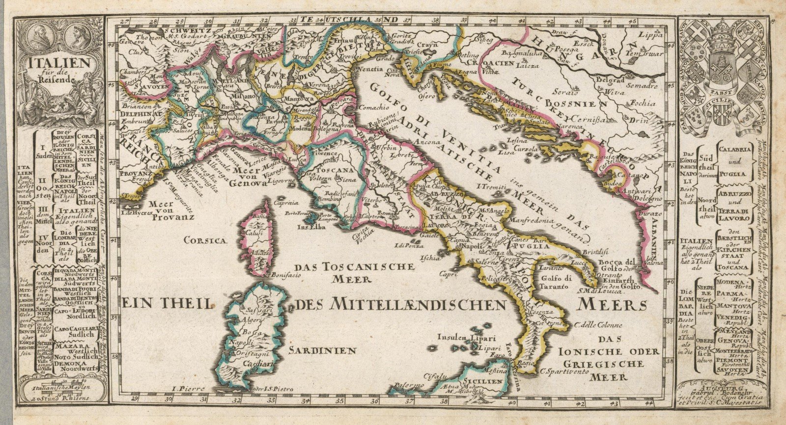 Carta geografica, antica ed originale, dell'italia con i confini dell'epoca. Autore: Bodenher Gabriel. Luogo: Italia. Anno: 1720 ca. Tecnica: incisione in rame. Dimensioni: 162x307 mm
