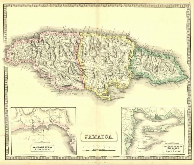 Carta geografica raffigurante i territori della Giamaica. Nella parte inferiore sono raffigurati i porti di Bluefields, Kingston e Port Royal. Piccoli fori di tarlo che non compromettono l'ottimo stato di conservazione generale. Attraente coloritura coeva all'acquerello.