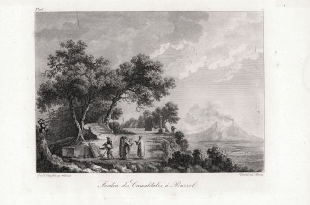 Veduta pubblicata nel ' Voyage Pittoresque ou description des Royaumes de Naples et de Sicile, opera in 5 volumi per la prima volta stampati a Parigi tra 1781 e il 1786. Richard de Saint-Non conobbe, durante il suo viaggio a Roma, i due già celebri pittori francesi Jean Honoré Fragonard e Hubert Robert, con i quali prosegue il suo viaggio per tutto il paese. Da questa grande amicizia nasce l’idea e la collaborazione per l’ambizioso progetto di documentare graficamente tutti i principali monumenti dell’Italia Meridionale e della Sicilia. Da qui, tra il 1781 ed il 1786, con l’aiuto di numerosi ed importanti architetti, pittori ed incisori, venne alla luce il Voyage Pittoresque ou description des Royaume de Naples et de Sicilie, opera composta di cinque volumi che uscirono annualmente. Incredibile sforzo tipografico, l’opera raccoglie quasi per intero gli appunti di viaggio del Saint-Non, adeguatamente assemblati e corretti; il corpus grafico è composto di ben 542 incisioni all’acquaforte e bulino, opera dei principali artisti di riproduzione del periodo. Da un punto di vista editoriale l’iniziativa riscuote immediatamente un grandissimo successo: il libro diviene un vero e proprio modello tipografico, sul quale sono basate diverse pubblicazioni dell’impero napoleonico. Dal punto di vista artistico le vedute, i paesaggi e le rovine conservano, e non può essere altrimenti, lo stile pittorico e romantico del Fragonard, del Robert, del Desprez, e di tutti gli altri artisti che collaborano nella realizzazione di questa monumentale opera. Il notevole successo commerciale della raccolta è testimoniato dalla ristampa, tra il 1795 ed il 1798, delle sole tavole pittoriche. Un’ulteriore edizione è stampata nel 1829 dal Dufour. Esemplare tratto dal ' Voyage Pittoresque, ' seconda edizione del 1795/98, priva dell’indicazione del privilegio reale. ' Acquaforte, stampata su carta vergata coeva, leggere ossidazioni, per il resto in ottimo stato di conservazione. View taken from the Voyage Pittoresque ou description des Royaume de Naples et de Sicilie by Richard de Saint-Non. During his trip to Rome, Richard de Saint-Non met two already famous French painters, Jean Honoré Fragonard and Hubert Robert, with whom he travelled along Italy. Their friendship led to the cooperation for the ambitious project of depicting all the main monuments of Southern Italy and Sicily. Between 1781 and 1786, with the assistance of many contemporary artists, he realized the Voyage Pittoresque ou description des Royaume de Naples et de Sicilie, a five volumes work published annually. As a result of a great typographical effort, the work is a collection of Sain-Non’s travelling notes; the graphic part is made up of 542 engravings and etchings, realized by the most important artists of the period. The work is immediately successful, for the book became a new typographical model for the following publications. From an artistic point of view, the views, landscapes and antiquity keep the Romantic pictorial style of Fragonard, Robert, Desprez and all the other artists that took part in this monumental project. The re-issue, between 1795 and 1798, of the pictorial plates, witnesses the great success of this project. A re-issue of the whole work was edited in 1829 by Dufour. ' Example taken from the second edition of the work, printed in Paris 1795/98; the plates are without the Royal priviledge. ' Etching, printed on contemporary laid paper, light foxing, otherwise good condition. Cfr.