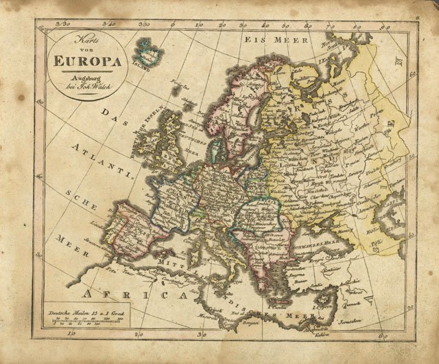 Piccola carta geografica, antica ed originale. Coloritura coeva con alcune macchie. Autore: Walch Johannes edit. Luogo: Europa. Anno: 1812. Tecnica: incisione in rame. Dimensioni: 210x250 il foglio. mm