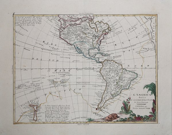 Carta geografica tratta dall’Atlante novissimo, illustrato ed accresciuto sulle osservazioni e scoperte fatte dai più celebri e più recenti geografi. Stampato in quattro volumi da Antonio Zatta tra il 1779 ed il 1785. Atlante fra i più belli e completi mai pubblicati in Italia nel XVIII secolo, l'opera più famosa dello Zatta. L’Atlante Novissimo, come si specifica anche nel titolo, è “accresciuto sulle osservazioni scoperte fatte dai più celebri e più recenti geografi”. Tra le novità più significative vi è la comparsa delle nuove isole scoperte nell'Oceano Pacifico da James Cook e la prima carta italiana della Nuova Zelanda. Le illustrazioni furono ' ideate e disegnate dai suoi collaboratori Giovanni Marco Pitteri, Anton Friedrich Busching, Pietro Antonio Novelli ed incise da Giuliano Zuliani. Il primo tomo dell’atlante è introdotto da un breve saggio di geografia generale dove l’autore definisce in modo sintetico e preciso gli elementi che compongono i reticoli eclittico ed equatoriale usati nelle tavole. Interessante la sezione dove si sofferma ' a descrivere il fenomeno della precessione degli equinozi e quello della variazione ciclica dell'obliquità dell'eclittica. Acquaforte, stampata su carta vergata coeva, coloritura coeva dei contorni, in buone condizioni. Map from the Atlante novissimo, illustrato ed accresciuto sulle osservazioni e scoperte fatte dai più celebri e più recenti geografi. Printed in four volumes by Antonio Zatta between 1779 and 1785. ' Atlas among the most beautiful and complete ever published in Italy in the eighteenth century, the most famous work of Zatta. The Atlante Novissimo, as also specified in the title, is “increased on the observations made by the most famous and most recent geographers”. Among the most significant innovations there is the appearance of the new islands discovered in the Pacific Ocean by James Cook and the first Italian map of New Zealand. The illustrations were designed and drawn by his collaborators Giovanni Marco Pitteri, Anton Friedrich Busching, Pietro Antonio Novelli and engraved by Giuliano Zuliani. The first volume of the atlas is introduced by a brief essay of general geography where the author defines in a concise and precise way the elements that make up the ecliptic and equatorial grids used in the tables. Interesting is the section where he pauses to describe the phenomenon of precession of the equinoxes and the cyclical variation of the obliquity of the ecliptic. Etching, printed on contemporary laid paper, contemporary outline coloring, in good condition. Cfr.