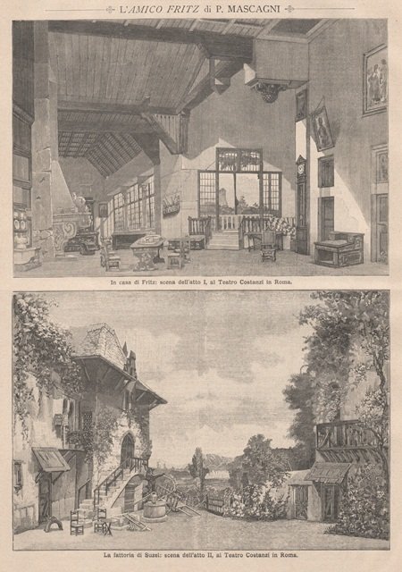 Due vedute: l’interno della casa di Fritz e la fattoria. L’opera fu rappresenta al Teatro dell’Opera il 31 ottobre 1891