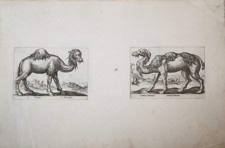 Due incisioni impresse su un foglio di carta vergata, disegnate ed incise, all'acquaforte e al bulino, da Antonio Tempesta. Le due immagini furono pubblicate nella serie ' Nuova raccolta de li Animali più curiosi del mondo […], di Antonio Tempesta, opera che conobbe numerose edizioni dopo la prima ' del ' 1620, edita ' da Giandomenico de Rossi.L'opera è un bestiario, privo di testo, che comprende in buona parte la prima e ampia iconografia zoologica, ma anche animali fantastici della tradizione mitologica, come il grifone o il satiro marino. ' Le immagini dell'opera, nella prima edizione 222, erano distribuite su 111 fogli oblunghi, con due lastre stampate per ciascun foglio. Ciascuna immagine ha una didascalia con il nome dell'animale raffigurato in latino e in italiano. ' Foglio in ottimo stato di conservazione con margini originali. ' Dimensioni della singola incisone: 137x97. ' Due incisioni impresse su un foglio di carta vergata, disegnate ed incise, all'acquaforte e al bulino, da Antonio Tempesta. Le due immagini furono pubblicate nella serie ' Nuova raccolta de li Animali più curiosi del mondo […], di Antonio Tempesta, opera che conobbe numerose edizioni dopo la prima ' del ' 1620, edita ' da Giandomenico de Rossi. L'opera è un bestiario, privo di testo, che comprende in buona parte la prima e ampia iconografia zoologica, ma anche animali fantastici della tradizione mitologica, come il grifone o il satiro marino. ' Le immagini dell'opera, nella prima edizione 222, erano distribuite su 111 fogli oblunghi, con due lastre stampate per ciascun foglio. Ciascuna immagine ha una didascalia con il nome dell'animale raffigurato in latino e in italiano. ' Foglio in ottimo stato di conservazione con margini originali. ' Dimensioni della singola incisone: 137x97. Cfr.