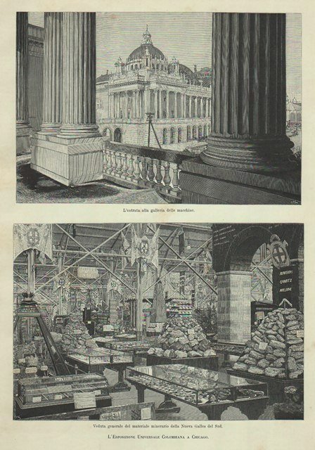 Due vedute in unico foglio: L’entrata alla galleria delle macchine - Veduta generale del materiale minerario della Nuova Galles del Sud. Testo al retro