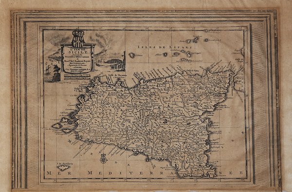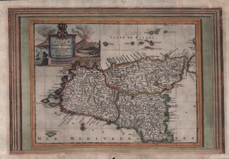 La carta è racchiusa in una cornice decorativa. Era parte della ' Galerie Agreable du Monde, il famoso atlante di Vander Aa, completato nel 1729 e consistente in più di 3000 mappe. La carta è pubblicata, per la prima volta, in ' Le Nouveau Theatre du Monde, ou la Geo- graphie Royale, Composée De Nouvelle Cartes Tres-Exactes, Dres- sées sue les Observations de Messieurs de l'Academie des Sciences à Paris. Avec une Description Geographique Et Historique Des Quatres Parties de L'Univers, Desquelles L'Europe en detail est écrite Par Mr. Gueudeville. & les trois autres Par Mr. Ferrarius A Leide, Chez Pierre van der Aa, Marchand Libraire. ' MDCCXIII. Il volume si compone di 95 mappe composte due a due su ogni foglio, la Sicilia è abbinata all'Irlanda. Il volume è dedicato a Francesco Cornaro, figlio primogenito del Doge Giovanni Cornaro (1647-1722), eletto nel 1709. “Si tratta della seconda mappa della Sicilia pubblicata da Van der Aa nel giro di un paio di anni. L'orientamento, la configurazione e le coordinate dell'isola cambiano, rispetto alla mappa precedente, anche in maniera profonda per cui, ad esempio, la latitudine di Palermo inizia ad avvicinarsi a quella di Messina e la costa settentrionale ha un andamento che si sviluppa quasi intorno a un parallelo. Ma la differenza maggiore si riscontra nelle longitudini e nello sposta- mento verso ovest del primo meridiano che, secondo la nuova valutazione proposta da Guillaume Delisle, era collocato a 20° a ovest di Parigi. Da questo consegue che la longitudine di Messina passa dai 39°30' stabiliti nella ' Geographia ' di Tolomeo ai 33°43', con uno spostamento di circa 6° verso ovest, effetto che porterà anche al ridimensionamento dell'intero bacino del mare Mediterraneo. La variazione delle longitudini, nelle due carte pubblicate da Van der Aa, è ancora maggiore rispetto alla discrepanza con Tolomeo, poiché l'autore della carta pubblicata nel 1711 usa le coordinate di Blaeu, che compaiono per la prima volta in una carta della Sicilia nel 1628, secondo le quali Messina era posizionata addirittura a 51°55' circa” (cfr. V. Valerio, ' Sicilia 1477-1861, p. 380). Incisione in rame, finemente colorata a mano, in ottimo stato di conservazione. Rara. ' Bibliografia: Valerio-Spagnolo "Sicilia 1477-1861", pp. 379-380, n. 183. La carta è racchiusa in una cornice decorativa. Era parte della ' Galerie Agreable du Monde, il famoso atlante di Vander Aa, completato nel 1729 e consistente in più di 3000 mappe. La carta è pubblicata, per la prima volta, in ' Le Nouveau Theatre du Monde, ou la Geo- graphie Royale, Composée De Nouvelle Cartes Tres-Exactes, Dres- sées sue les Observations de Messieurs de l'Academie des Sciences à Paris. Avec une Description Geographique Et Historique Des Quatres Parties de L'Univers, Desquelles L'Europe en detail est écrite Par Mr. Gueudeville. & les trois autres Par Mr. Ferrarius A Leide, Chez Pierre van der Aa, Marchand Libraire. ' MDCCXIII. Il volume si compone di 95 mappe composte due a due su ogni foglio, la Sicilia è abbinata all'Irlanda. Il volume è dedicato a Francesco Cornaro, figlio primogenito del Doge Giovanni Cornaro (1647-1722), eletto nel 1709. “Si tratta della seconda mappa della Sicilia pubblicata da Van der Aa nel giro di un paio di anni. L'orientamento, la configurazione e le coordinate dell'isola cambiano, rispetto alla mappa precedente, anche in maniera profonda per cui, ad esempio, la latitudine di Palermo inizia ad avvicinarsi a quella di Messina e la costa settentrionale ha un andamento che si sviluppa quasi intorno a un parallelo. Ma la differenza maggiore si riscontra nelle longitudini e nello sposta- mento verso ovest del primo meridiano che, secondo la nuova valutazione proposta da Guillaume Delisle, era collocato a 20° a ovest di Parigi. Da questo consegue che la longitudine di Messina passa dai 39°30' stabiliti nella ' Geographia ' di Tolomeo ai 33°43', con uno spostamento di circa 6° verso ovest, effetto che porterà anche al ridimensionamento dell'intero bacino del mare Mediterraneo. La variazione delle longitudini, nelle due carte pubblicate da Van der Aa, è ancora maggiore rispetto alla discrepanza con Tolomeo, poiché l'autore della carta pubblicata nel 1711 usa le coordinate di Blaeu, che compaiono per la prima volta in una carta della Sicilia nel 1628, secondo le quali Messina era posizionata addirittura a 51°55' circa” (cfr. V. Valerio, ' Sicilia 1477-1861, p. 380). Incisione in rame, in ottimo stato di conservazione. Rara. ' Bibliografia: Valerio-Spagnolo "Sicilia 1477-1861", pp. 379-380, n. 183. Cfr.