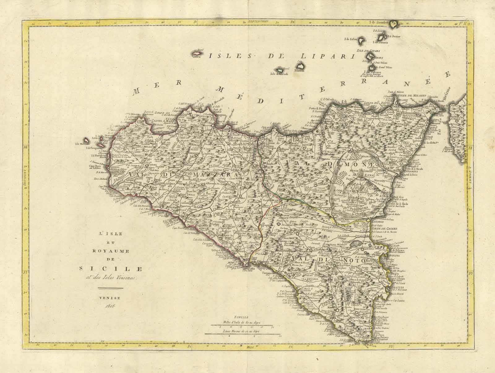 Carta geografica, entro margine graduato, raffigurante il territorio della Sicilia. Il presente esemplare rappresenta il secondo stato della carta precedentemente realizzata per illustrare "Atlas Universel dressé sur les meilleures cartes modernes" pubblicata a Venezia da Santini e Remondini nel 1784. Rispetto alla precedente, nell'angolo in alto a sinistra, scompare il decorativo cartiglio con il titolo, semplicemente coperto in fase di stampa; mentre nell'angolo in basso a sinistra non troviamo più il disegno dell'isola di Malta, il quale viene coperto per essere sostituito da un nuovo cartiglio in cui il titolo si trova in campo libero. Sempre in fase di stampa viene coperta "Explication des Marques", nell'angolo in basso a destra, ora non più presente. Dello stato precedente permangono le scale grafiche riportate in basso al centro. L'incisione presenta coloritura confinale coeva all'acquerello. Piega centrale editoriale. Ottimo stato di conservazione generale. Rara