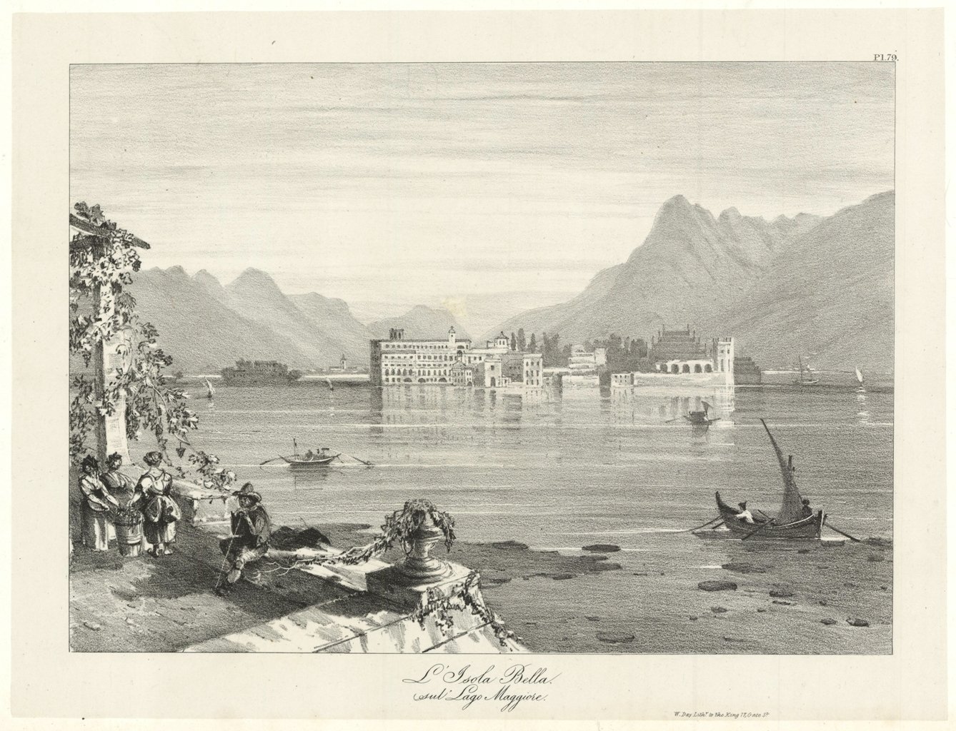 Veduta dell'isola Bella pressa dalla sponda occidentale. La scena è animata da alcuni personaggi; tra questi un gruppo di donne son dedite alla raccolta dei grappoli d'uva.
