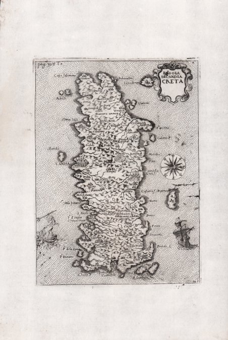 Deriva dalla carta di Matteo Pagano del 1538. Secondo stato di quattro con la firma del Bonifacio in basso a destra. Come giustamente fa notare il Meurer il lavoro cartografico più noto del Bonifacio fu la serie delle mappe raffiguranti le isole dell’arcipelago greco, sia del Mar Jonio che dell’Egeo. Esse non sono datate e quindi è difficile assegnare una sequenza cronologica alla serie, databile al periodo 1567/68. Come tutte le carte della cosiddetta scuola lafreriana venivano stampate a se e quindi assemblate in atlanti compositi. Questo esemplare è tratto dall'opera ' Universus terrarum orbis scriptorum calamo delineatus . qui de Europae, Asiae, Africae, & Americae regnis, provinciis, populis, civitatibus. pubblicata a Padova nel 1713, presso Matteo Cadorin, da Raffaello Savonarola, sotto lo pseudonimo di Lasor a Varea (o Varela). L'opera era una sorta di enciclopedia che conteneva notizie sulle varie località del mondo disposte in ordine alfabetico, arricchita da mappe e vedute di tutto il mondo che appartengono a celebri raccolte cartografiche del passato – Bertelli, Valegio, Camocio, Bonifacio, Nelli, Magini e altri – del quale probabilmente l’editore Cadorin era in possesso delle matrici originali. Incisione su rame, ampi margini, in ottimo stato di conservazione. After the Matteo Pagano map of 1538 published in Venice. The probably best known cartographic works of the engraver Natale Bonifacio is a serie of maps showing Greek Islands in the Ionian en Aegean Seas. They are all undated and their chronological sequence is difficult to ascertain. Like the larger maps of The IATO these smaller ones were first issued for a loose sheet circulation, and then assembled in booklet form for interested customer. This example is taken from the work ' Universus terrarum orbis scriptorum calamo delineatus . qui de Europae, Asiae, Africae, & Americae regnis, provinciis, populis, civitatibus. ' published in Padua in 1713, at Matteo Cadorin, by Raffaello Savonarola, under the pseudonym of Lasor a Varea (or Varela). The work was a kind of encyclopedia containing news about the various localities of the world arranged in alphabetical order, enriched with maps and views of the whole world belonging to famous cartographic collections of the past-Bertelli, Valegio, Camocio, Bonifacio, Nelli, Magini, and others-of which the publisher Cadorin probably possessed the original plates. Copper engraving, in excellent condition. Cfr. Zacharakis, A catalogue of printed maps of Greece, 337/208; Meurer, The Strabo illustrated Atlas p. 105, 91.