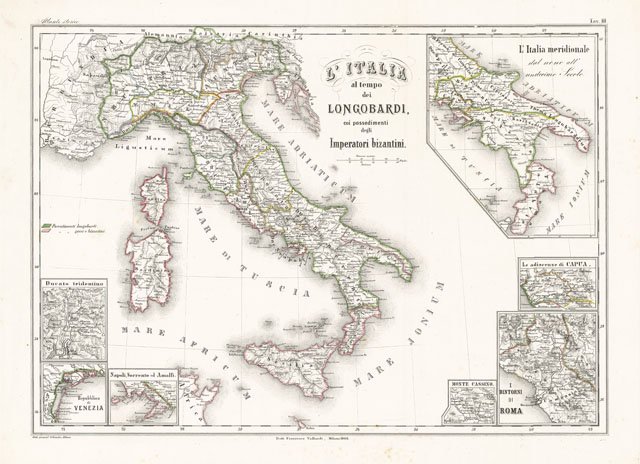 L'Italia al tempo dei Longobardi coi possedimenti degli Imperatori bizantini | Stampe | Vallardi Francesco edit.