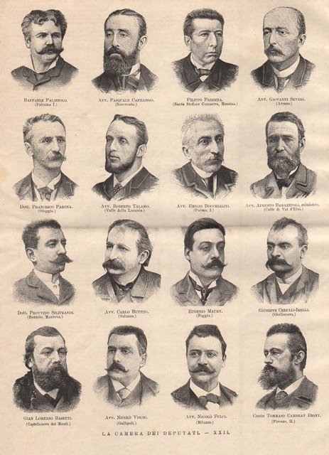 Ritratti di sedici deputati in unico foglio: Raffaele Palizzolo, Pasquale Capilongo, Filippo Florena, Giovanni Severi, Freancesco Parona, Roberto Talamo, Emilio Bocchialini, Augusto Barazzuoli, Provvido Siliprandi, Carlo Buttini, Eugenio Maury, Giuseppe Cerulli Irelli, Lorenzo Basetti, Nicolò Fulci e Tommaso Cambray Digny. Testo al retro