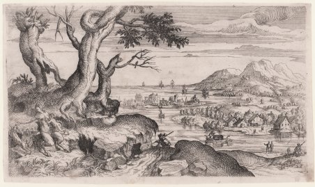 Acquaforte, circa 1559, priva di firma. Esemplare nel primo stato di due, avanti l’indirizzo di Camocio. Magnifica prova, impressa su carta vergata coeva con filigrana non leggibile, con margini, piccole ossidazioni, per il resto in ottimo stato di conservazione.L’opera appartiene alla serie dei Paesaggi con soggetti mitologici relativa al breve periodo veneziano del Duperac, con le influenze derivanti dalla pittura di Tiziano. Robert-Dusmenil elenca solo la prova con l’indirizzo “Apud Camocium” inserito nella pietra in basso al centro. Rarissima. Etching, circa 1559, without signature. Example of the first state of two, before the address of Camocio. A fine impression, printed on contemporary laid paper with unidentified watermark, with margins, small spots, generally in very good conditions. The work belongs to the series of landscapes with mythological subjects relating to the short period of Venetian Duperac, with influences stemming from painting by Titian. Robert-Dusmenil lists only the test with the address "Apud Camocium" inserted in the stone at the bottom center.Etienne Duperac is an architect , painter , engraver and surveyor. Towards 1559 he came to Rome, where he stayed for more than twenty years, working with compatriot Lafrery . During this period, however, reported several times in France: the Felibien reminds the author of five paintings of sea gods and of the loves of Jupiter and Callisto, were destroyed in 1967, which decorated a bathroom in the palace of Fontainebleau. Along his journey to Rome, staying briefly in Venice, a presence that is attested by some engravings for the publisher Giovanni Francesco Camocio. The work in question is related to the Venetian period, and is clearly influenced by the Venetian painting of the period , especially the works of Domenico Campagnola. However, there are also elements that lead to the landscapes engraved by Leon Davent and also by Battista del Moro and Angelo Falconetto .An extremely rare work. Cfr. Robert-Dusmenil, VIII, 62.