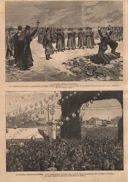 Due vedute in unico foglio: Due disertori russi della guarnigione di Odessa furono obbligati a scavarsi la fossa e poi furono fucilati sull’orlo della medesima - La dimostrazione di Tokio per l’arrivo degli incrociatori del cantiere di Genova. Testo al retro