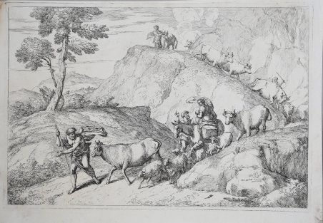 Acquaforte e puntasecca, 1760 circa, priva di data ed indicazioni editoriali. Stato unico. Da un disegno di Giovan Battista Castiglione. Della serie “Varii Capricci, e paesi inventati, e disegnati dal celebre Gio. Benedetto Castiglione Genovese tratti dalla raccolta zanettiana. Incisi all'acquaforte da Gaetano Zompini Pittore Veneto. Ora novamente raccolti, e pubblicati”, edita a Venezia nel 1786. Quest’edizione del 1786 comprende un frontespizio, inciso da Giuseppe Maria Del Pian, e 12 tavole, di cui le prime tre dedicate all’educazione di Achille. Poiché tre tavole della serie sono datate 1758 e due 1759, è probabile che una prima edizione della serie, senza frontespizio, e limitata a pochissimi esemplari, sia stata ultimata verso il 1760. La raccolta fu riedita nel 1786 su iniziativa di John Strange divenuto proprietario, tramite l’agente Giovanni Maria Sasso, dei rami acquistati presso gli eredi Zanetti. Cinque rami della serie recano il monogramma ' AMZ ' di Antonio Maria Zanetti a cui in passato, erroneamente, sono state attribuite tutte le incisioni. La teoria era anche avvalorata dal fatto che quattro stampe recano in calce, nel primo stato, la dedica a personaggi amici di Zanetti, e dalla lettera del 16 gennaio 1759 in cui Algarotti, scrivendo a Zanetti, lodava due stampe derivate da disegni di Castiglione. Santifaller, invece, evidenziò le affinità stilistiche tra le stampe derivate da Castiglione e quelle di Zompini, attribuendone a lui le incisioni. Sopher suggerisce che Zanetti abbia aggiunto il suo monogramma e le dediche ad amici e parenti al fine di far passare le stampe come sue, come una sorta di scherzo. Algarotti sarebbe stato uno dei destinatari che erano stati ingannati. Bozzolato (1978) suggerì che Zanetti iniziò l'opera ma poi la consegnò a Zompini, "senza dubbio il vero autore". La collaborazione con Zanetti sarebbe limitata a poche lastre, probabilmente le cinque che recano il monogramma AMZ. Magnifica prova, impressa su carta vergata coeva con filigrana delle “tre mezze lune”, con margini, in buono stato di conservazione. Bibliografia D. Succi, ' La Serenissima nello specchio di rame, pp. 765-769, n. 69; ' Bozzolato 7, TIB p. 117, 80. Etching and drypoint, circa 1760, lacking date and editorial markings. Only state. After a drawing by Giovan Battista Castiglione. From the series ' “Varii Capricci, e paesi inventati, e disegnati dal celebre Gio. Benedetto Castiglione Genovese tratti dalla raccolta zanettiana. Incisi all'acquaforte da Gaetano Zompini Pittore Veneto. Ora novamente raccolti, e pubblicati”, published in Venice in 1786. This edition of 1786 includes a frontispiece, engraved by Giuseppe Maria Del Pian, and 12 plates, the first three of which are dedicated to the education of Achilles. Since three plates of the series are dated 1758 and two 1759, it is likely that a first edition of the series, without frontispiece, and limited to very few copies, was completed around 1760. The collection was reissued in 1786 on the initiative of John Strange became the owner, through the agent Giovanni Maria Sasso, of the plates purchased from the heirs Zanetti. Five plates of the series bear the monogram ' AMZ ' of Antonio Maria Zanetti to whom, in the past, were erroneously attributed all the engravings. The theory was also supported by the fact that four prints bear at the bottom, in the first state, the dedication to people who were friends of Zanetti, and by the letter of January 16, 1759 in which Algarotti, writing to Zanetti, praised two prints derived from drawings by Castiglione. Santifaller, on the other hand, pointed out the stylistic affinities between the prints derived from Castiglione and those of Zompini, attributing the engravings to him. Sopher suggests that Zanetti added his monogram and dedications to friends and relatives in order to pass the prints off as his own, as a sort of joke. Algarotti would have been one of the recipients who were duped. Bozzolato (1978) suggested that Zanetti started the work but then handed it over to Zompini, "without a doubt the real author". The collaboration with Zanetti would be limited to a few plates, probably the five bearing the ' AMZ ' monogram. Magnificent proof, printed on contemporary laid paper with watermark of the "three half moons", with margins, in good condition. Bibliografia D. Succi, ' La Serenissima nello specchio di rame, ' pp. 765-769, n. 69; Bozzolato 7, TIB p. 117, 80. Cfr.