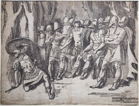 Chiaroscuro a tre legni, 1540-50 circa, in basso a destra iscrizione 'POLIDORO DA CARAVAGIO/INVENT AA in mantoua [160]8'. Da un soggetto di Polidoro da Caravaggio. Esemplare nel secondo stato di due, con l’indirizzo di Andreani e la data aggiunti sulla firma “IO?NIC?VICEN”. Magnifica prova, impressa su carta vergata coeva con filigrana “balestra nel cerchio con stella” irregolarmente rifilata alla linea marginale, in ottimo stato di conservazione. La composizione riproduce una delle scene dipinte à grisaille da Polidoro di Caravaggio sulle facciate di diversi palazzi romani, oggi scomparse. La scena raffigurata è stata interpretata come La morte di Aiace, il più valoroso degli eroi greci. Quando, dopo la morte di Achille, non lui ma Ulisse viene giudicato il più degno di ricevere in consegna le armi dell'eroe, Aiace non sopporta l'affronto e medita di vendicarsi; ma la dea Atena gli toglie il senno. Aiace, impazzito, fa strage del bestiame dei Greci, credendo di uccidere Agamennone e Menelao responsabili dell'ingiusto verdetto. Tornato in sé, vergognandosi delle azioni commesse, decide di suicidarsi trafiggendosi con la propria spada. Nella composizione, Aiace è sulla sinistra, a terra appoggiato ad un albero, mentre con la mano sinistra leva in alto lo scudo. Dietro di lui, un gruppo di soldati greci; a destra si distingue la figura del re Menelao seduto e, all’estrema destra, una figura in piedi, con lo sguardo basso e le braccia conserte, da alcuni identificato con Agamennone. Secondo Barryte, forse il momento rappresentato è quello immediatamente successivo alla decisione del consiglio e la figura in piedi a destra, le braccia incrociate e lo sguardo verso il basso è Ulisse - non Agamennone - che non vuole vantarsi del suo successo, proprio per la reazione di Aiace che cade a terra, contorcendosi in amara delusione e si volta dall’altra parte rispetto al gruppo di soldati, come a non voler guardare coloro dai cui ha appena ricevuto l’offesa. È probabile che il chiaroscuro venne eseguito non direttamente dalla scena della facciata, bensì a partire da un disegno preparatorio o addirittura da una copia. La disposizione serrata delle figure e la fedele riproduzione delle armature documentano lo stile antiquario a rilievo sviluppato da Polidoro negli anni Venti del secolo. Bibliografia Bartsch A., Le peintre graveur, Vienna, 1803-1821, v. XII, p. 96, n. 5; Le Blanc IV.116.7; Oberhuber, K., Gnann, A., 'Roma e lo stile classico di Raffaello (1515-1527)', n. 220; B. Barryte, Myth, Allegory and Faith. The Kirk Edward Long Collection of Mannerist Prints, Cinisello Balsamo, 2015, n. 104; Takahatake N., Atlante delle xilografie italiane del Rinascimento, ALU.0989.1. Chiaroscuro woodcut from three blocks in green, grey and black. Inscribed with inventor's name, publisher's address and date lower left: 'POLIDORO DA CARAVAGIO/INVENT AA in mantoua [160]8'. After Polidoro da Caravaggio. Example of the second state of two, with Andreani’s address added at lower right. Magnificent proof, printed on contemporary laid paper with watermark "crossbow in circle with star" irregularly trimmed at marginal line, in excellent condition. Presumably, the composition is based on one of the numerous “all’antica” composiitions with which Polidoro da Caravaggio ornated the facades of Roman palaces, the majority of which have vanished. The scene depicted was interpreted as The death of Ajax. When Achilles was killed, his armor was to be awarded to the next greatest Greek hero. The armor led to a dispute between Ajax and Odysseus. Both heroes felt entitled to it. To settle the matter, the Greeks decided to take a vote, and they awarded the armor to Odysseus. Enraged by this decision, Ajax planned an assault on the Greek troops that night. However, Athena, the goddess of wisdom, drove Ajax temporarily insane, and he attacked a flock of sheep instead. After recovering his senses, he was so ashamed that he killed himself with the sword Hector had given him Vicentino’s print illustrates dying hero to left leaning against tree, with the left raised with shield; right leg bent beneath him; behind to right group of Greek warriors; King Menelaus seated and Agamemnon in foreground. According Barryte, perhaps this is the moment after the fate of the armor is decided and the figure standing to the right, arms crossed and head down is Odysseus - not Agamemnon -, unwilling to boast of his success as Ajax falls the ground, writhing in bitter disappointment and unwilling to face those by whom he felt wronged. Bibliografia Bartsch A., Le peintre graveur, Vienna, 1803-1821, v. XII, p. 96, n. 5; Le Blanc IV.116.7; Oberhuber, K., Gnann, A., 'Roma e lo stile classico di Raffaello (1515-1527)', cat. n. 220; B. Barryte, Myth, Allegory and Faith. The Kirk Edward Long Collection of Mannerist Prints, Cinisello Balsamo, 2015, n. 104; Takahatake N., Atlante delle xilografie italiane del Rinascimento, ALU.0989.1. Cfr.