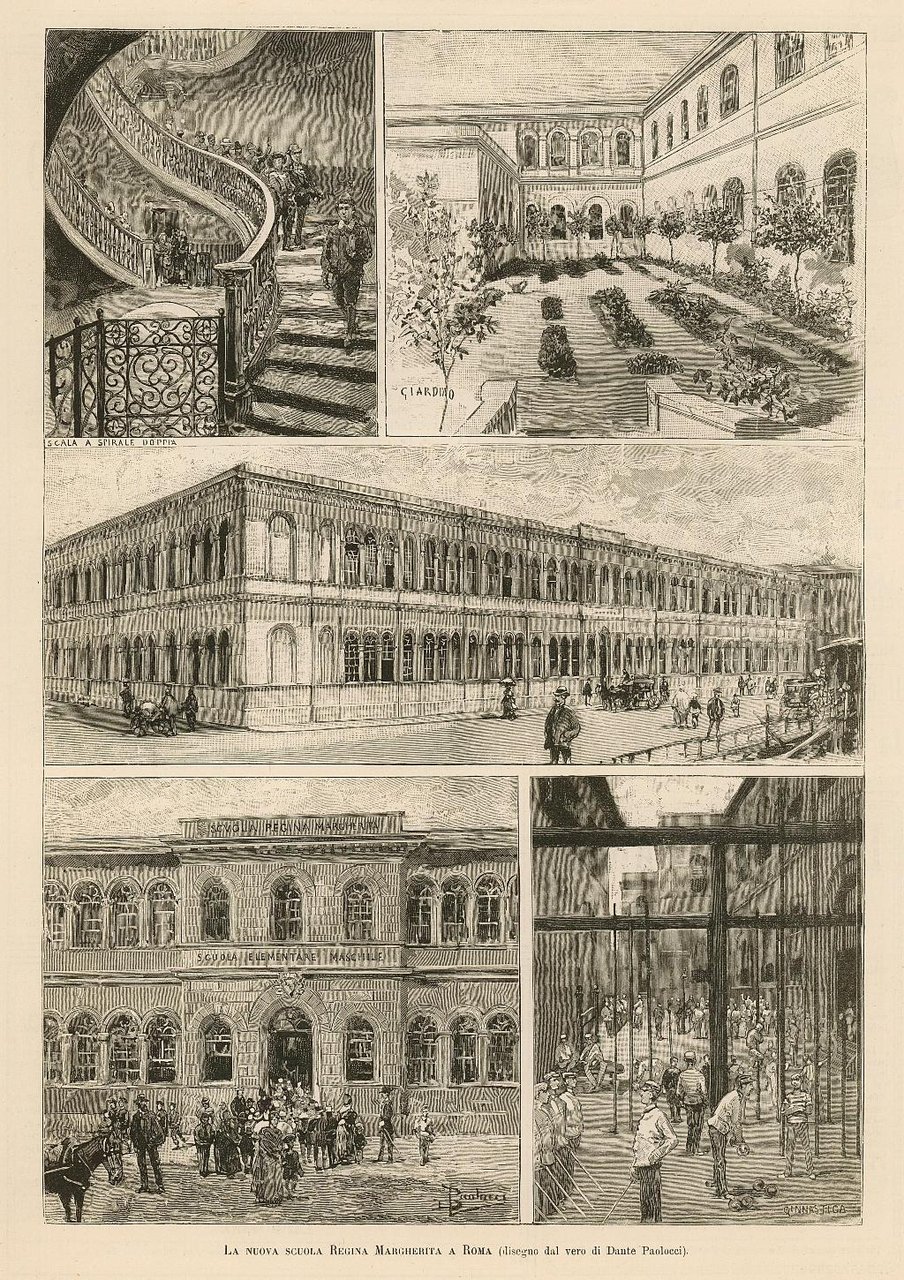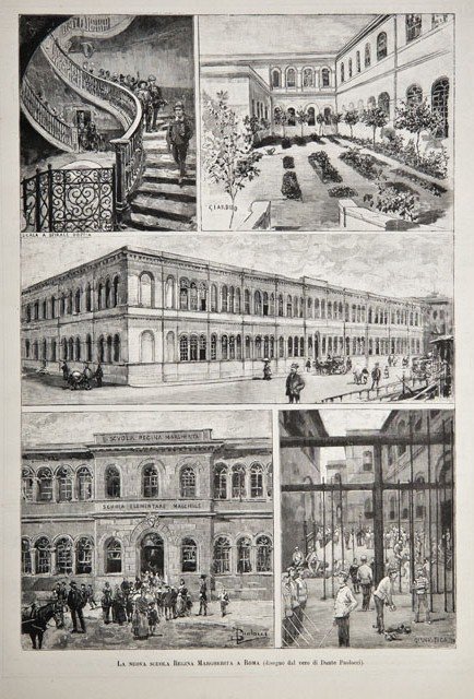 Stampa antica ed originale raffigurante in diverse vignette la nuova scuola Regina Margherita a Roma. Testo al retro non inerente