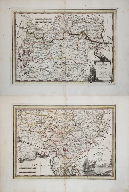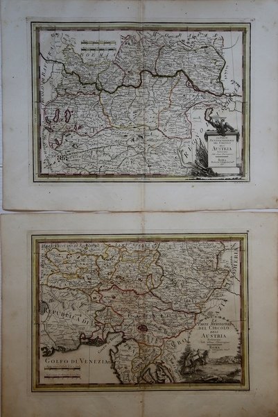 EDIZIONE ORIGINALE, COLORITURA COEVA -Dettagliate carte geografiche incentrate rispettivamente sulla parte meridionale e su quella settentrionale dell'Austria.Tratte dal "Nuovo Atlante Geografico Universale delineato sulle ultime osservazioni", edito a Roma dal 1792 fino al 1801, opera che la Calcografia Camerale commissionò al Cassini al fine di sostituire l’ormai obsoleto "Mercurio Geografico".Giovanni Maria Cassini, Chierico Regolare Somasco fu geografo e cartografo, ma anche intagliatore di architetture e prospettive - uno dei migliori discepoli di Giovanni Battista Piranesi - Cassini fu uno degli ultimi sferografi italiani del Settecento ed i suoi globi ebbero una notevole diffusione, come pure questo "Nuovo Atlante Geografico".Incisione in rame, coloritura coeva dei contorni, leggere bruniture, per il resto in ottimo stato di conservazione.L'Atlante del Cassini fu ristampato dalla Calcografia Camerale nel primo quarto del XIX secolo, prima del 1839. Solo gli esemplari di prima edizione come questo sono stampati su carta vergata coeva e sono colorati a mano in epoca. Le tirature del XIX secolo sono già su carta meccanica, priva di vergelle, e generalmente in bianco e nero. - FIRST EDITION, CONTEMPORARY OUTLINE COLOUR -The Italian painter and engraver, Giovanni Maria Cassini, produced these detailed maps Austria. Published in: Nuovo atlante geografico universale delineato sulle ultime osservazioni. Roma, Calcografia camerale, 1792-1801.Cassini was geographer and cartographer but he was also good at engraving architectural items and perspectives – he was one of the best disciples Giovanni Battista Piranesi had. Moreover, Cassini was one of the last artists to engrave spheres in the XVIII century and his globes were quite famous and widespread, and realized the most important Italian Atlas of the XVIII century; his maps always bear a cartouche, extremely rich in colours and details. Copperplate with fine original hand colour, some foxing, otherwise in very good condition. Cfr.