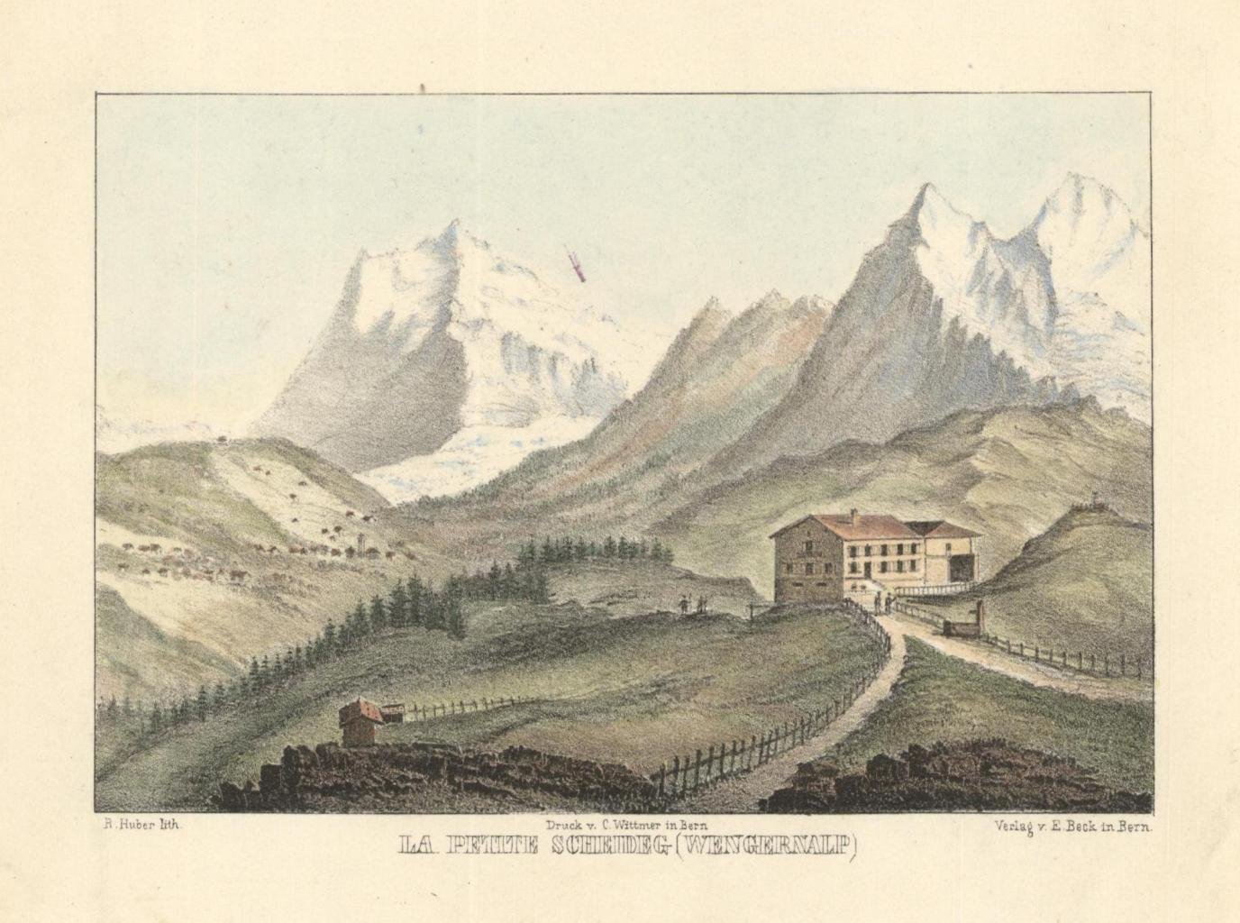 Graziosa veduta delle Alpi Bernesi viste la Wengernalp, in leggera coloritura coeva. Autore: Huber R. lith. Luogo: Wengernalp - Oberland Bernese. Anno: 1840 ca. Tecnica: litografia. Dimensioni: 97x143 mm