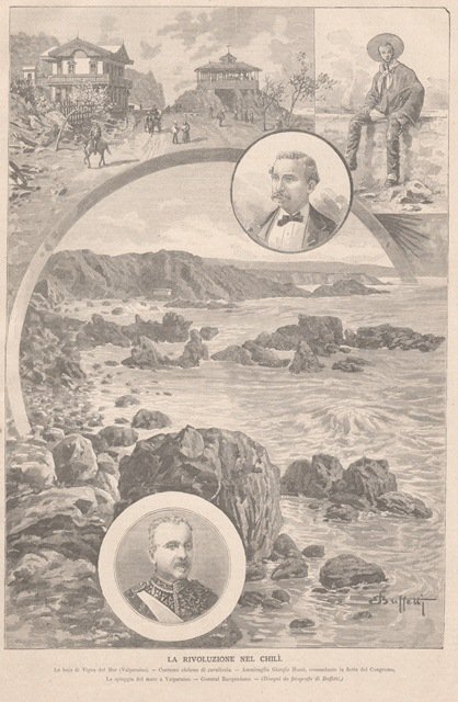 Composizione di immagini: la baia di Vina del Mar, costume cileno, ammiraglio Giorgio Montt, la spiaggia a Valparaiso e il generale Bacquedano. Testo al retro