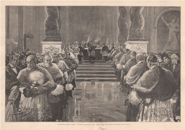 Veduta interna della basilica di San Pietro la sera del giovedì Santo. Piega editoriale. Testo al retro
