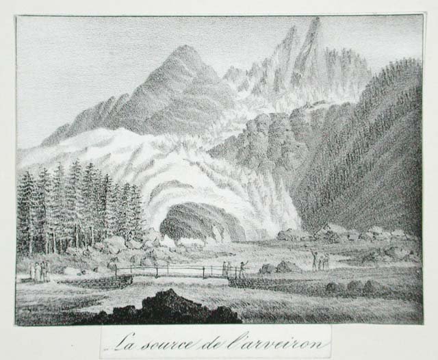 Sorgente dell'Arveiron dal ghiacciaio del Monte Bianco. La stampa è ridimensionata ai margini ed è stata applicata anticamente su di un cartoncino