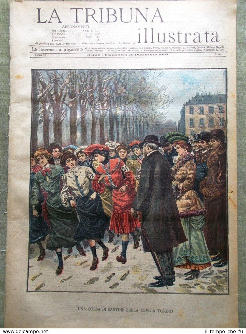 La Tribuna Illustrata Rivista originale del 13 Dicembre 1903 Anno 11 - N. 50 Rarità per appassionati e collezionisti Seguono solo alcuni dei fatti descritti, illustrati e fotografati all'interno Illustrato in copertina (segue foto): Una corsa di sartine sulla neve a Torino Illustrato nella retro copertina (segue foto): Sprofondamento lugubre a Calabritto Nelle pagine interne: La raccolta delle castagne Sport e neve a Torino Un monumento romano in Romania La ferrovia elettrica del Vesuvio L'università cattolica di Ottawa in fiamme. L'appartamento Borgia in pericolo Due ambasciatori: il signor Nelidof e il principe Urusof .e tanto altro ancora! Qualora vogliate maggiori delucidazioni contattateci In questo negozio troverai un'intera categoria dedicata alle Tribune Illustrate, sotto il link diretto alla collezione: Riviste disponibili Cliccaci sopra, troverai di certo ciò che cerchi! La Tribuna Illustrata fu un settimanale italiano pubblicato a Roma. Insieme a La Domenica del Corriere e a L'Illustrazione Italiana fu il settimanale illustrato preferito dagli Italiani nel periodo che intercorse dalla fine dell'800 all'avvento della televisione. Fondato nel 1890 come supplemento del quotidiano La Tribuna, il primo numero uscì il 6 gennaio, il formato della rivista era cm 27 x 38, un formato poco più grande del tabloid. La prima ed ultima pagina erano a colori, disegnate da pittori e incisori affermati. Ogni numero conteneva 16 pagine. I principali collaboratori furono: Luigi Capuana, Adolfo De Bosis, Alfredo Fabrizi, Gandolin, Giuseppe Giacosa, Attilio Luzzato, Enrico Panzacchi, Rastignac, Attilio Sarfatti, Armand Silvestre, Ettore Socci, Gaspare Ungarelli, Pio Vanzi, Annie Vivanti. Il Corredo iconografico fu di prim'ordine. I principali pittori, disegnatori ed illustratori furono: Basilio Cascella e i figli Tommaso e Michele, Enrico Lionne, Aleardo Terzi, Augusto Bompiani, Roberto Bompiani, Domenico Bruschi, Modesto Faustini, Rubens Santoro, Rafael Senet, Cesare Tiratelli. Tra i romanzi a puntate che vi uscirono ricordiamo: L'invincibile, di Gabriele D'Annunzio Una giovinezza, di Francois Coppée e Zia Aurelia di André Theuriet, questi ultimi due entrambi illustrati da Emile Bayard. Paypal Carta di credito Bonifico bancario Spedizione con posta prioritaria o raccomandata scelta dall'acquirente nel momento del pagamento