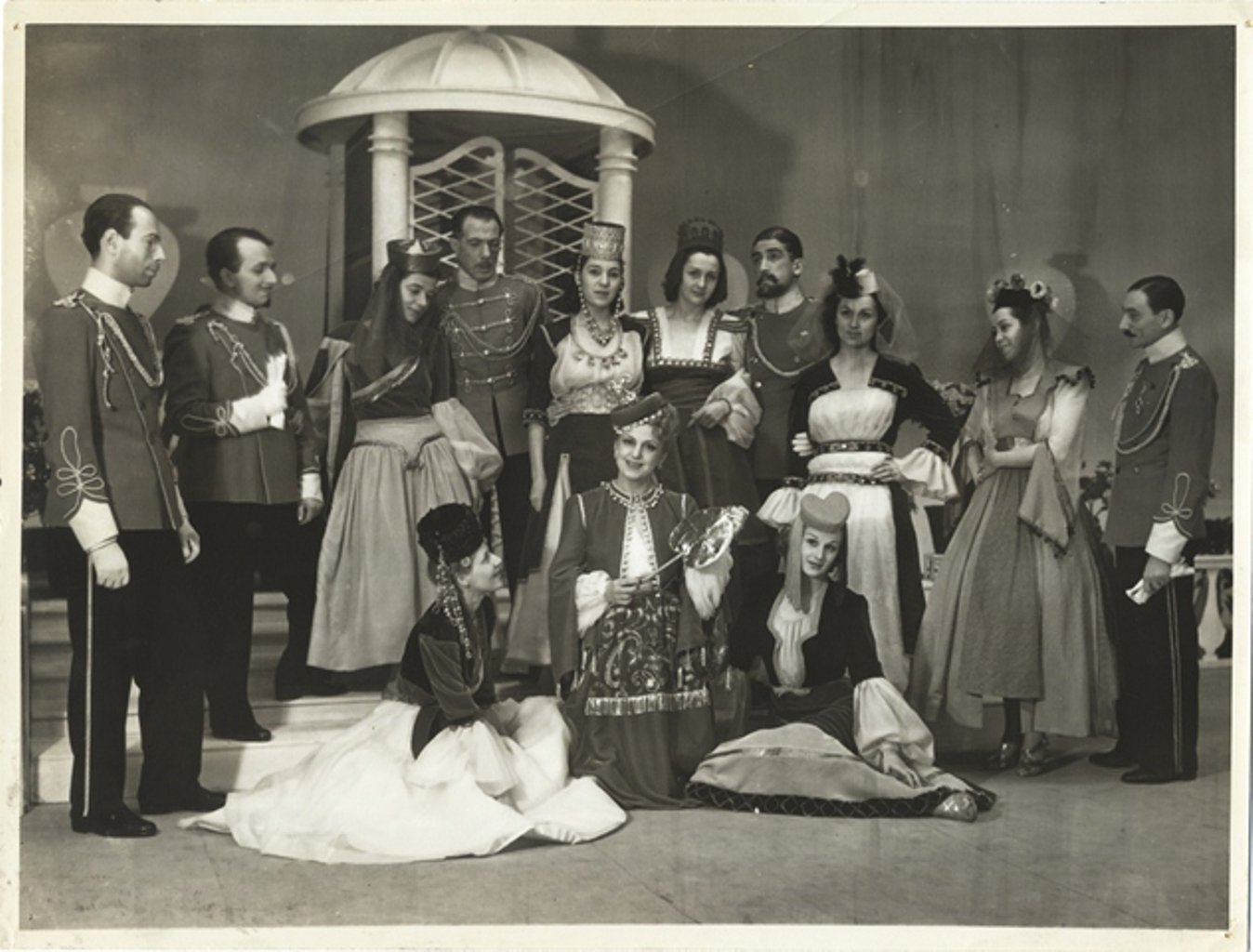 Fotografia originale di gruppo della Compagnia Adani - Cimara durante la rappresentazione di “La vedova allegra”. In basso al centro l’attrice Laura Adani (Modena 1913 – Moncalieri 1996)