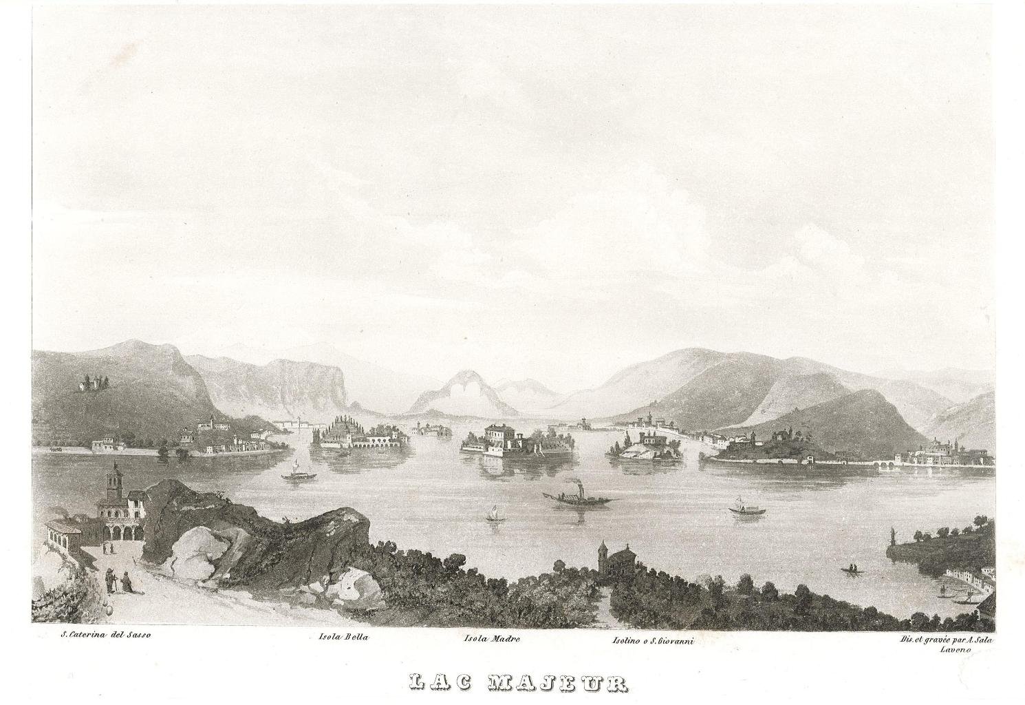 Graziosa e rara veduta panoramica del lago Maggiore presa dalla sponda orientale nei pressi di S. Caterina del Sasso. La veduta fa parte di una serie di incisioni edite dalla ditta Genevresi e Vallanzasca di cui nell'angolo in basso a destra si nota il timbro a secco. Al centro della raffigurazione spiccano le isole Borromee: la Bella, la Madre e l'isola Pescatori. L'incisione si presenta ridimensionata al margine superiore senza perdita di parte incisa.