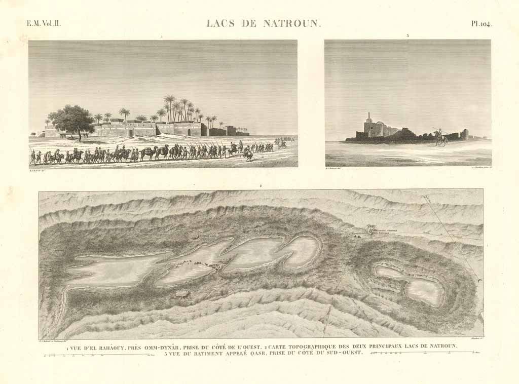 Due vedute e carta topografica di laghi contenenti il natron (carbonato idrato di sodio) nei pressi di Qsar. Tavola incisa all’acquaforte su lastra di rame, inserita nella monumentale opera Description de l’Egypte, II° edizione dal 1820-29 voluta da Luigi XVIII, importante risultato culturale dell’occupazione francese in Egitto per il periodo che va dal 1798 al 1801. Bonaparte decise di invadere queste terre per controllare le vie commerciali verso l’india ed assestare in questo modo un duro colpo all’economia britannica. Durante questa operazione, il Nostro favorì l’attività di numerosi artisti, ingegneri, matematici e naturalisti per registrare e catalogare con estrema precisione le costruzioni e i monumenti egiziani nonché la flora e la fauna. Il risultato di questo immane sforzo, che per la pubblicazione coinvolse quasi duemila tra artisti e tecnici oltre a quattrocento incisori, fu l’opera "Description de l’Egypte, ou recueil des observations et des recherches qui ont été faites en Egypte pendant l’expédition de l’armée française", che offre una globale visione scientifica dell’antico e moderno Egitto, nonché la sua storia naturale. La Description ebbe grande influenza sul movimento orientalista pittorico dell’ottocento e diede un contributo fondamentale alla diffusione dell’Egittologia. Numerosi edifici rappresentati in queste tavole sono stati completamente distrutti nel tempo