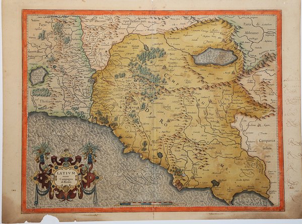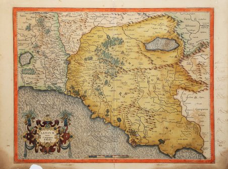 La carta viene preparata da ' Gerard Mercator per il suo ' Italia, Sclavoniae et Graeciae tabula geographicae ' (Duisburg, 1589) che comprende un frontespizio allegorico e 22 carte geografiche della penisola, dei Balcani e della Grecia. Successivamente le carte sono ristampate nell’Atlantis Pars Altera ' (1595) ' pubblicato postumo alla morte del Mercatore, dallo stampatore di Duisburg ' Albert Buys, sotto la supervisione del figlio Rumold Mercator. Composto da sei parti – pubblicate separatamente tra il 1589 e il 1594 – comprende 107 mappe, tutte tranne la carta del mondo di Rumold, firmate da Gerard Mercator. Le lastre vennero poi acquistate da Jodocus Hondius, che tra il 1606 e il 1630 le utilizzò per il suo ' Atlas Sive Cosmographicae Meditationes de Fabrica Mundi, integrandole ed aggiornandole con proprie “nuove” carte. Delle mappe di Mercator sono note anche ristampe curate da Johannes Janssonius. Le edizioni Hondius e Janssonius ebbero un grande successo commerciale e furono stampate in più lingue, con il testo al verso della carta in latino, francese, tedesco e olandese. La carta è incisa con i connotati tipici dell'opera mercatoriana. Le montagne sono allineate in un concetto di area montuosa, non per indicare vere catene o valli, ed hanno una struttura con qualche differenza nella dimensione, ma simile per quanto riguarda la forma, con pendici verticali e cime piatte. Le città sono mostrate attraverso castelli più o meno grandi caratterizzati da tetti slanciati ed aguzzi, simili a cappelli di mago. ' Esemplare tratto da ' Atlas Sive Cosmographicae Meditationes de Fabrica Mundi ' di Jodocus Hondius. Incisione in rame, coloritura coeva, leggere abrasioni alla piega centrale, per il resto in buono stato di conservazione. Bibliografia cfr. Koeman II Me 11 e Koeman II Me 13A, 1595); Van der Krogt 1:002; J. Keuning, ' The History of an Atlas, in “Imago Mundi” IV (1947) pp. 37-43; ' World Encompassed ' p. 134; ' Istituto di Studi Romani, a cura di A. Frutaz, "Le Carte del Lazio", XVII.4 tav. 45. The map is prepared by Gerard Mercator for his ' Italia, Sclavoniae et Graeciae tabula geographicae ' (Duisburg, 1589), which includes an allegorical frontispiece and 22 maps of Italy, the Balkans and Greece. Later, the maps are reprinted in the ' Atlantis Pars Altera ' (1595) published posthumously after the death of Mercator, by the Duisburg printer Albert Buys, under the supervision of his son Rumold Mercator. Composed of six parts - published separately between 1589 and 1594 - it includes 107 maps, all except Rumold's map of the world, made by Gerard Mercator. The plates were then purchased by Jodocus Hondius, who between 1606 and 1630 used them for his ' Atlas Sive Cosmographicae Meditationes de Fabrica Mundi, ' integrating and updating them with his own "new" maps. Of Mercator's maps are also known reprints edited by Johannes Janssonius. The Hondius and Janssonius editions had a great commercial success and were printed in several languages, with the text on the back of the map in Latin, French, German and Dutch. The map is engraved with the typical connotations of Mercatorian work. The mountains are aligned in a mountainous area concept, not to indicate true chains or valleys, and have a structure with some differences in size, but similar in shape, with vertical slopes and flat tops. The cities are shown through more or less large castles characterized by slender and pointed roofs, similar to wizard hats. Example taken from the ' Atlas Sive Cosmographicae Meditationes de Fabrica Mundi ' by Hondius. Copper engraving, in good condition. Bibliografia cfr. Koeman II Me 11 e Koeman II Me 13A, 1595); Van der Krogt 1:002; J. Keuning, ' The History of an Atlas, in “Imago Mundi” IV (1947) pp. 37-43; ' World Encompassed ' p. 134. Cfr.
