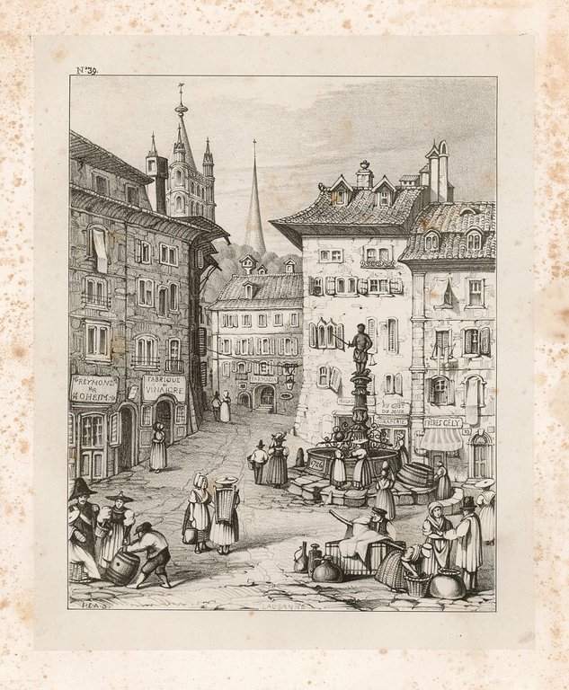 Litografia, antica ed originale stampata su carta cina, raffigurante il mercato nel centro di Losanna. fecente parte della deliziosa raccolta di 40 litografie che ritraggono scorci e vedute di villaggi e città da Ghent a Francoforte, Verona, Bologna, Firenze, Roma e Genova, ecc. a titolo "Italy, Switzerland, Belgium. a series of original drawings on stone by I.E.A. Dolby" pubblicata a Londra nel gennaio del 1836.