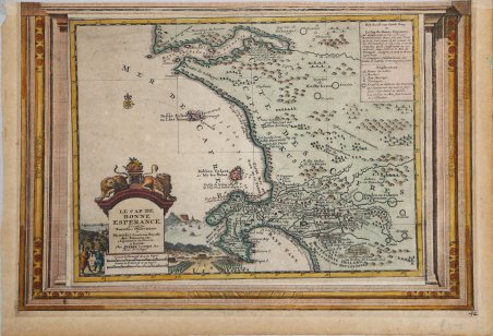 Piccola carta, estremamente dettagliata, del Capo da Saldanha a False Bay. Il magnifico cartiglio in basso a sinistra mostra una veduta di Table Bay sullo sfondo e il giardino del Governatore sulla destra. La carta è racchiusa in una cornice decorativa. Era parte della "Galerie Agreable du Monde", il famoso atlante di Vander Aa, completato nel 1729 e consistente in più di 3000 mappe. Incisione in rame con coloritura d’epoca successiva, in buone condizioni. This is a small detailed map of the Cape from Saldanha to False Bay. The attractive cartouche on lower left shows a view of Table Bay in the background, and the Governor’s garden on the right. The map is sourranded by a decorative engraved frame; included in the Galerie Agreable du Monde, the well-known atlas by Vander Aa, completed in 1729 and containing over 3000 maps. Copperplate with later hand colour, in good condition. Cfr. O. I. Norwich, "Norwich's Maps of Africa", map 212.