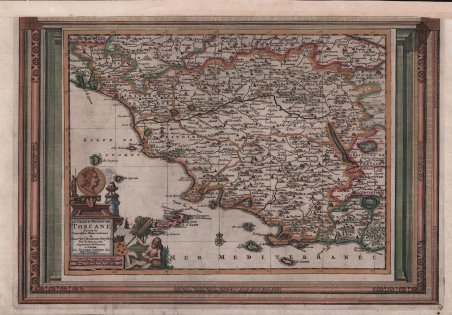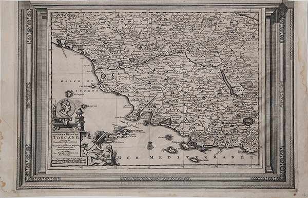 Carta geografica della Toscana tratta dalla "La Galerie agreable du monde. divisée en LXVI tomes.Cette partie comprend le tome premiere de Genes, Lucques, Toscane, & l'Etat de l'Eglise" edita a Leida nel 1713. Incisione in rame, in buono stato di conservazione. Non comune. Copper engraving, in good condition. Cfr.