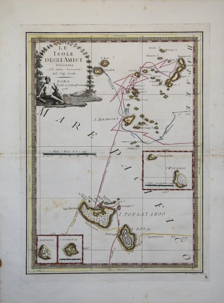 - EDIZIONE ORIGINALE, COLORITURA COEVA -Decorativa mappa dell'arcipelago Tonga tratta dal "Nuovo Atlante Geografico Universale delineato sulle ultime osservazioni", edito a Roma dal 1792 fino al 1801, opera che la Calcografia Camerale commissionò al Cassini al fine di sostituire l’ormai obsoleto "Mercurio Geografico".I primi ad approdare alle isole Tonga furono J. Lemaire e W. C. Schouten, ai quali questo gruppo di isole non si presentò ospitale, per il carattere degli abitanti (1616). Migliore accoglienza incontrarono nel 1643 Abel Tasman, che toccò il solo gruppo meridionale, e Samuel Wallis nel 1767. Il Cook, che vi approdò nel 1773, vi si trovò tanto bene, che le chiamò "Le isole degli Amici" (Friendly Islands); quando vi tornò nel 1777 vi indugiò quasi due mesi, mantenendo sempre ottimi rapporti con quegli abitanti. Le isole settentrionali furono scoperte nel 1781 dallo spagnolo F. A. Mourelle.Giovanni Maria Cassini, Chierico Regolare Somasco fu geografo e cartografo, ma anche intagliatore di architetture e prospettive - uno dei migliori discepoli di Giovanni Battista Piranesi - Cassini fu uno degli ultimi sferografi italiani del Settecento ed i suoi globi ebbero una notevole diffusione, come pure questo "Nuovo Atlante Geografico".Incisione in rame, coloritura coeva dei contorni, leggere bruniture, per il resto in ottimo stato di conservazione. FIRST EDITION, CONTEMPORARY OUTLINE COLOUR -The Italian painter and engraver, Giovanni Maria Cassini, produced this attractive map of the Tonga Islands, with Cook's tracks decoratively traced between them. Tonga became known as the Friendly Islands because of the hospitable reception given to Captain James Cook on his first visit in 1773.Published in: Nuovo atlante geografico universale delineato sulle ultime osservazioni. Roma, Calcografia camerale, 1792-1801.Cassini was geographer and cartographer but he was also good at engraving architectural items and perspectives – he was one of the best disciples Giovanni Battista Piranesi had. Moreover, Cassini was one of the last artists to engrave spheres in the XVIII century and his globes were quite famous and widespread, and realized the most important Italian Atlas of the XVIII century; his maps always bear a cartouche, extremely rich in colours and details. Copperplate with fine original hand colour, some foxing, otherwise in very good condition. Cfr.