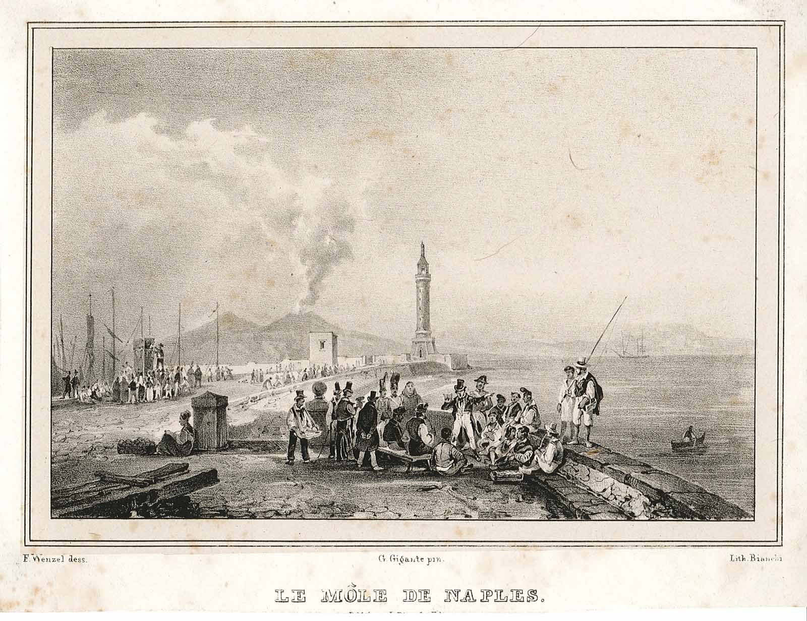 Veduta del porto animata da artisti di strada, sullo sfondo il Vesuvio fumante. Tratta dall'opera "Pittoresque et descriptives de la Ville de Naples et de ses Environs"