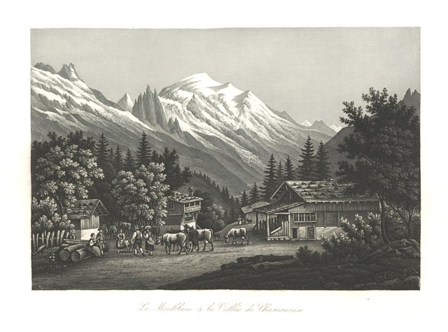 Piccola veduta della Valle di Chamonix con il Monte Bianco sullo sfondo. Autore: Dikenmann Rudolf dis. & H. Siegfried inc. Luogo: Monte Bianco. Anno: 1830 ca. Tecnica: acquatinta. Dimensioni: 128x190 mm