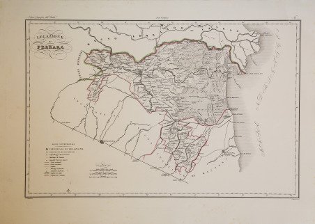 Carta geografica tratta dall’Atlante geografico degli Stati italiani delineato sopra le migliori e più moderne mappe per servire di corredo alla corografia fisica storica e statistica dell'Italia, di Attilio Zuccagni Orlandini stampato a Firenze, presso gli editori, 1844. In 2° massimo, 2 voll. Il primo volume contenente le carte dell’Italia Superiore in 52 fogli, il secondo volume quelle dell’Italia Inferiore in 77 fogli. Attilio Zuccagni Orlandini (1784-1872) nacque a Fiesole con il nome di Giuseppe Orlandini. In seguito all’adozione da parte del facoltoso zio materno Attilio Zuccagni (1754-1807), botanico e georgofilo, assunse il nome di Attilio Zuccagni Orlandini. La sua più importante opera è la relazione geografico-cartografica di tutti gli Stati preunitari italiani, la grandiosa Corografia fisica, storica e statistica dell’Italia e delle sue Isole (Firenze 1835-1845), in dodici volumi per diciannove tomi, con un volume introduttivo sull’intera penisola italiana. L’opera costituì la summa delle centinaia di opere geografiche generali, regionali e locali allora disponibili e presentava, per ogni Stato preunitario, la trattazione fisica, storica, topografica e un inquadramento statistico. Nel 1844-45, la Corografia fu arricchita con cinque volumi di cartografie, vedute e altre illustrazioni di luoghi e monumenti: Atlante geografico degli Stati italiani delineato sopra le migliori e più moderne mappe (due volumi con 144 tavole inclusa la grande carta della penisola in 15 fogli) e Atlante illustrativo ossia raccolta dei principali monumenti italiani antichi, del medio evo e moderni e di alcune vedute pittoriche (tre volumi con 413 illustrazioni, stampate su 269 fogli). Le tavole furono incise, sempre a Firenze, in due apposite officine, da quattro valenti artisti lombardi (Vittorio Angeli, Giacinto Maina, Pietro Manzoni e Giuseppe Pozzi). ' Soprattutto il primo dei due atlanti rappresenta, ancora oggi, una pietra miliare nella storia della cartografia e dell’iconografia geografica italiana. Fu veramente ‘un’ardua impresa’, dal momento che spesso mancavano ancora (come, ad esempio, per il Ducato di Lucca e lo Stato Pontificio) prodotti cartografici compiutamente geometrici. I due prodotti furono presentati ai Georgofili nel 1843 e nel 1844, insieme alla mappa della Repubblica di San Marino. L’opera si rivelò oltremodo costosa e non ottenne il successo commerciale sperato, ma servì da base per tante altre iniziative editoriali successive che vi attinsero, talora senza neppure rispettarne i diritti d’autore. Incisione in rame, coloritura coeva dei contorni, lievi ossidazioni, per il resto in ottimo stato di conservazione. ' Bibliografia Cfr. Anna Guarducci - Dizionario Biografico degli Italiani - Volume 100 (2020). Map taken from the Atlante geografico degli Stati italiani delineato sopra le migliori e più moderne mappe per servire di corredo alla corografia fisica storica e statistica dell'Italia, di Attilio Zuccagni Orlandini printed in Florence, 1844. The first volume contains the maps of Northern Italy in 52 sheets, the second volume those of Southern Italy in 77 sheets. Attilio Zuccagni Orlandini (1784-1872) was born in Fiesole under the name of Giuseppe Orlandini. Following adoption by his wealthy maternal uncle Attilio Zuccagni (1754-1807), a botanist and georgofile, he took the name Attilio Zuccagni Orlandini. His most important work is the geographic-cartographic report of all the pre-unification Italian states, the great Corografia fisica, storica e statistica dell'Italia e delle sue Isole (Florence 1835-1845), in twelve volumes for nineteen tomes, with an introductory volume on the entire Italian peninsula. The work constituted the sum of hundreds of general, regional and local geographic works then available and presented, for each pre-unification state, the physical, historical, topographical and statistical framework. In 1844-45, the Corografia was enriched with five volumes of maps, views and other illustrations of places and monuments: Atlante geografico degli Stati italiani delineato sopra le migliori e più moderne mappe (two volumes with 144 plates including the large map of the peninsula in 15 sheets) and Atlante illustrativo ossia raccolta dei principali monumenti italiani antichi, del medio evo e moderni e di alcune vedute pittoriche (three volumes with 413 illustrations, printed on 269 sheets). The plates were engraved, again in Florence, in two special workshops, by four talented Lombard artists (Vittorio Angeli, Giacinto Maina, Pietro Manzoni and Giuseppe Pozzi). ' Especially the first of the two atlases represents, even today, a milestone in the history of cartography and Italian geographic iconography. It was truly 'an arduous undertaking', since cartographic products were often still lacking (as, for example, for the Duchy of Lucca and the Papal States) fully geometric. The two products were presented to the Georgofili in 1843 and 1844, along with the map of the Republic of San Marino. The work proved to be very expensive and did not achieve the commercial success hoped for, but served as a basis for many other subsequent publishing initiatives that drew on it, sometimes without even respecting the copyright. ' Copperplate with fine outline colour, good condition. ' Literature Anna Guarducci - Dizionario Biografico degli Italiani - Volume 100 (2020). Cfr.